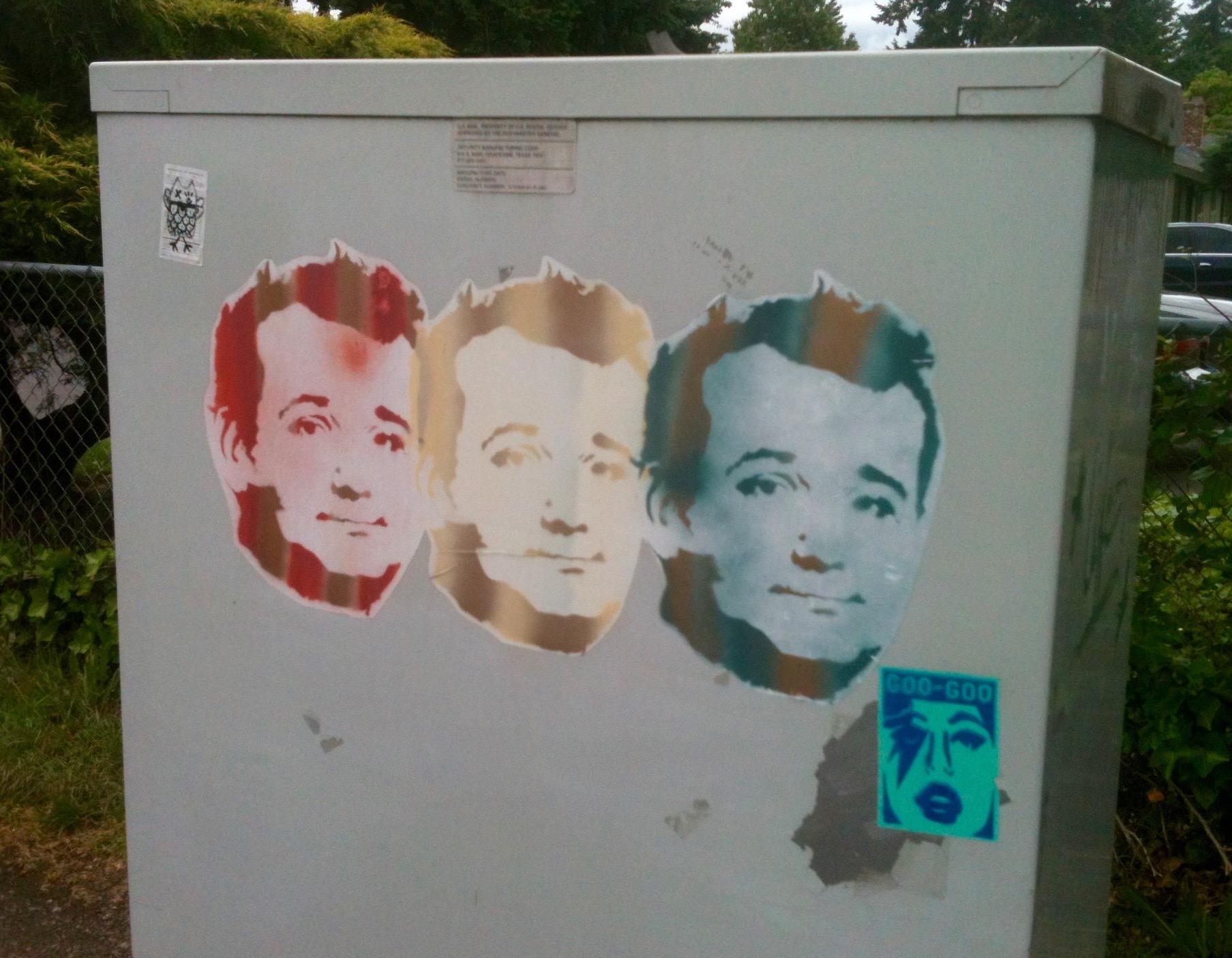 The work is marred only by a fellow vandal who decided to join the fray.  I have no problem with the sticker, subject matter or design. I’ve seen this sticker around and it seems a faint homage to Paul Stanley so maybe there’s a celebrity theme going on but I would have preferred to see the predominant piece of art given some space and not crowded out by a more colors and noise.  Don’t mess with Bill Murray with your GOO GOO for God’s sake.