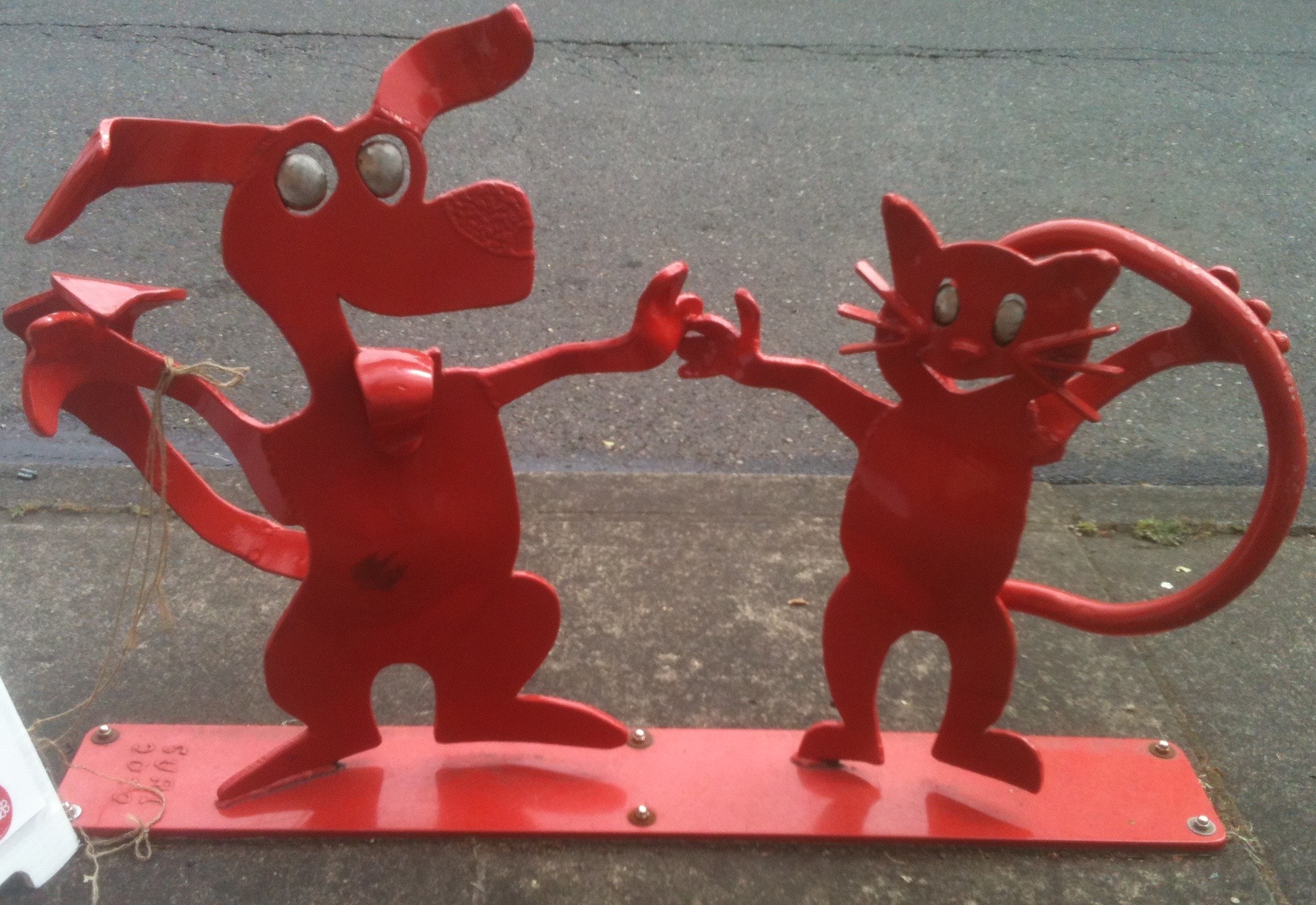 One of the more frisky, fun and sculpturally appealing art racks has to be this dancing cat and dog in front of a vet’s office. While it seems more cartoon than functional bike rack, I have to say it’s an enjoyable art work.
