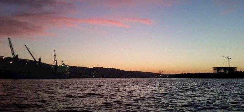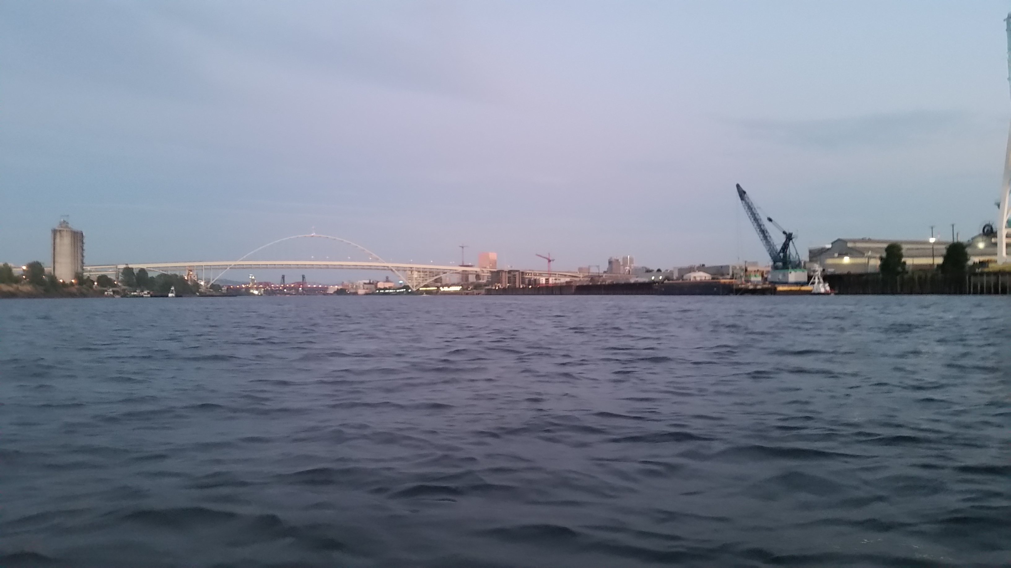 Once in the river we were surrounded by thin bands of pink clouds from an epic sunset. Everything was gorgeous from the reflections of the water to the light of the setting sun. People were camped out along the river bank. I listened to a woman haranguing someone from inside a tent. Otherwise it was quiet with the occasional boat creating a wake that had us bobbing up and down. The water that splashed on me from time to time was warmer than I thought it would be. We drifted past a giant navy ship, the USNS Charles Drew that was docked around the Vigor ship yard. Fireworks were starting early, before it got dark. We kayaked under five bridges getting a different perspective as we passed underneath them. Heading toward the Broadway bridge as it grew dark, we passed a small boat with a light on its stern. When asked if we were heading for the fireworks, I confirmed we were. The boat light was bright and seemed like a good idea but the people were giving up, calling it a night, turning away from the fireworks. People gathered on the Broadway bridge–an ideal place for firework observation. One of the onlookers yelled, “Shark” down at us. This was the least of my worries.