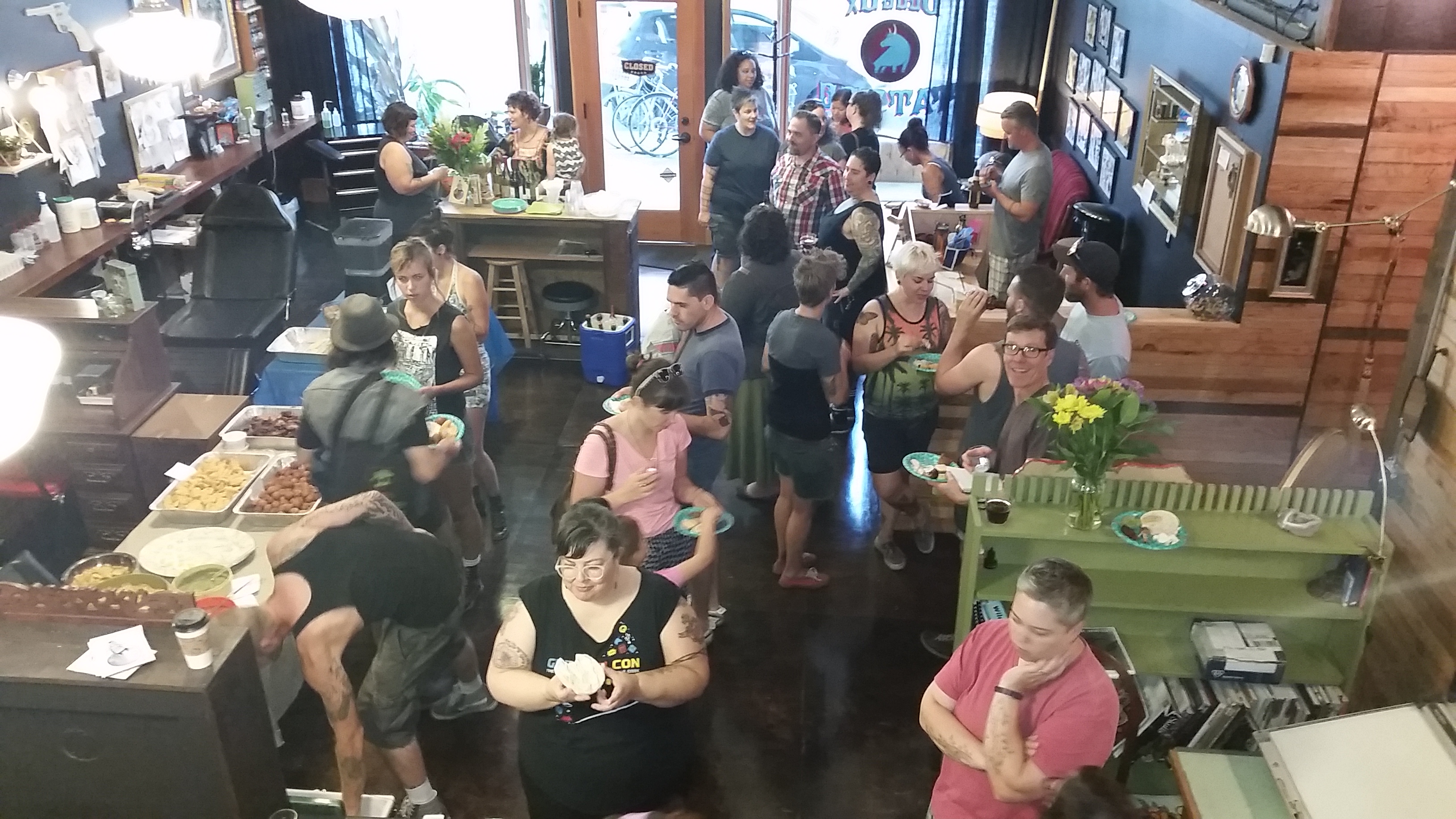 I didn’t know what to expect from a Tattoo Party but I was game. It was a Tuesday night (insert social calendar joke here) back on August 18th. I roped my wife, Ronna, to be the party photographer so I could balance a plate of hors d’oeuvres with my drink and my reporter’s notebook. What a party! There were tons of people, parent’s brought kids, cat fish, BBQ chicken wings, paleo cupcakes and Blood Orange Italian Soda were among the vittles, plus there were tattoos and a guy wearing a Judas Priest T-shirt. It was a great way to welcome a new business into the neighborhood or was the new business welcoming us?
