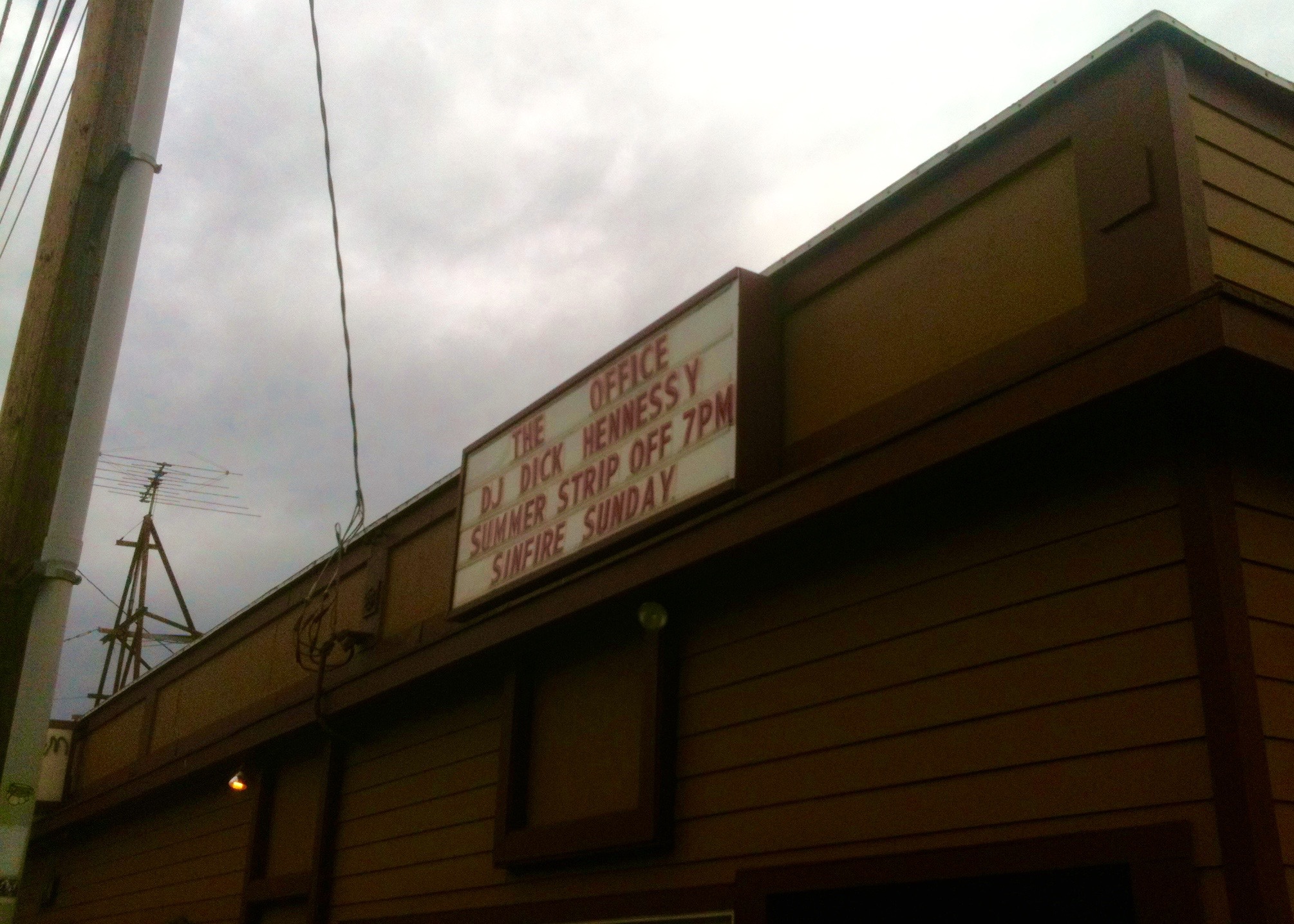 It wasn’t exactly clear that the Office was a strip club until information was posted on the marquee. I can’t figure out if a strip club replacing a bar is a step up, a lateral move or some kind of devolution. I suppose it wouldn’t matter one way or the other to those who patronize this kind of establishment. Please pardon my conflicted condescension. Portland is full of strip clubs so one more is like icing on the cake that a stripper jumps out of, that is if they still do that these days. I have nothing against strip clubs. I retain a certain pride towards the one in my neighborhood. In the end and the beginning, the marquee never changed. Everyday seemed like an advertisement for Sinfire Sunday. I can get a vicarious thrill imagining being in the midst of DJ Dick Hennessy slabbing down platters for the Summer Strip Off all summer long. Naming an event “Sinfire Sunday” seems like a miraculous means of drumming up Sunday business. Yet again it was strange that I never saw evidence of the place being open. No one entered and dancers never gathered outside in skimpy outfits taking smoke breaks.