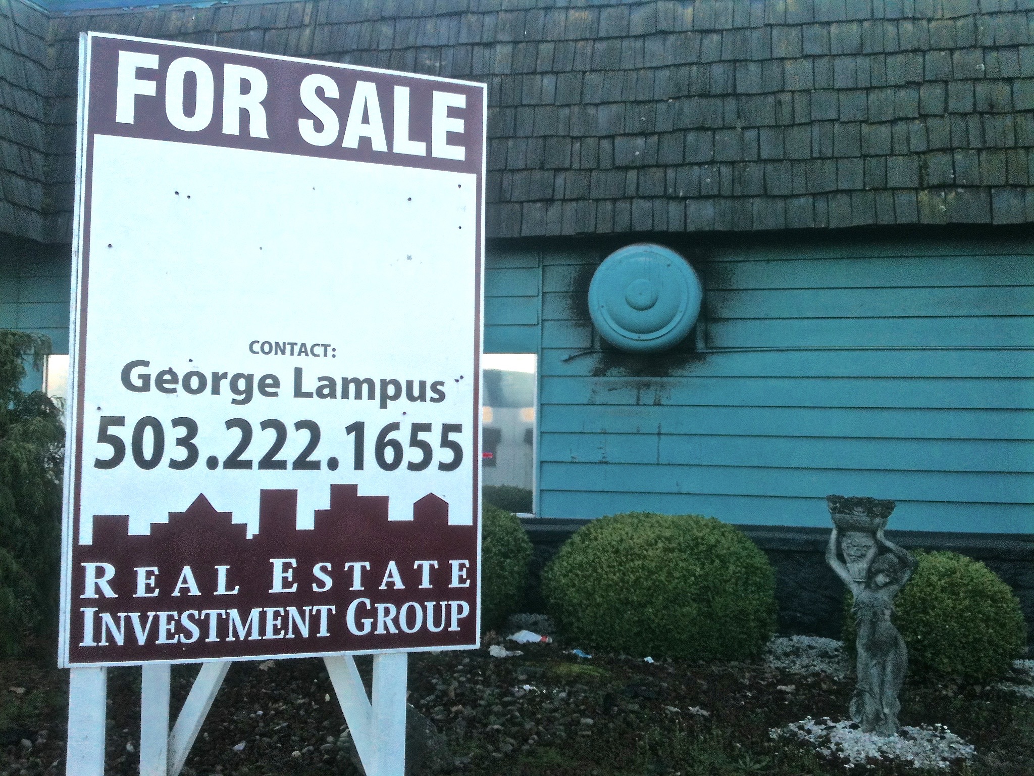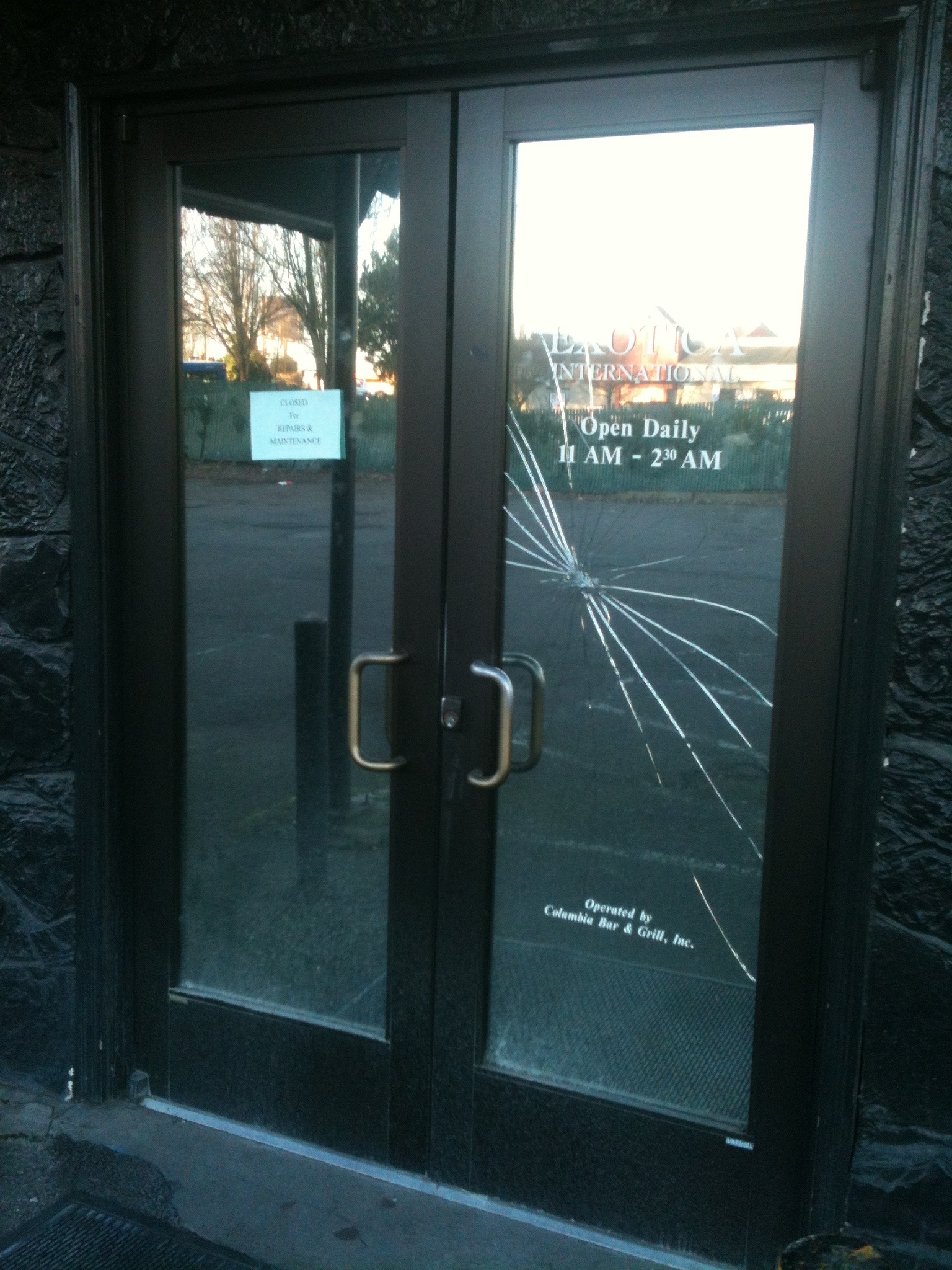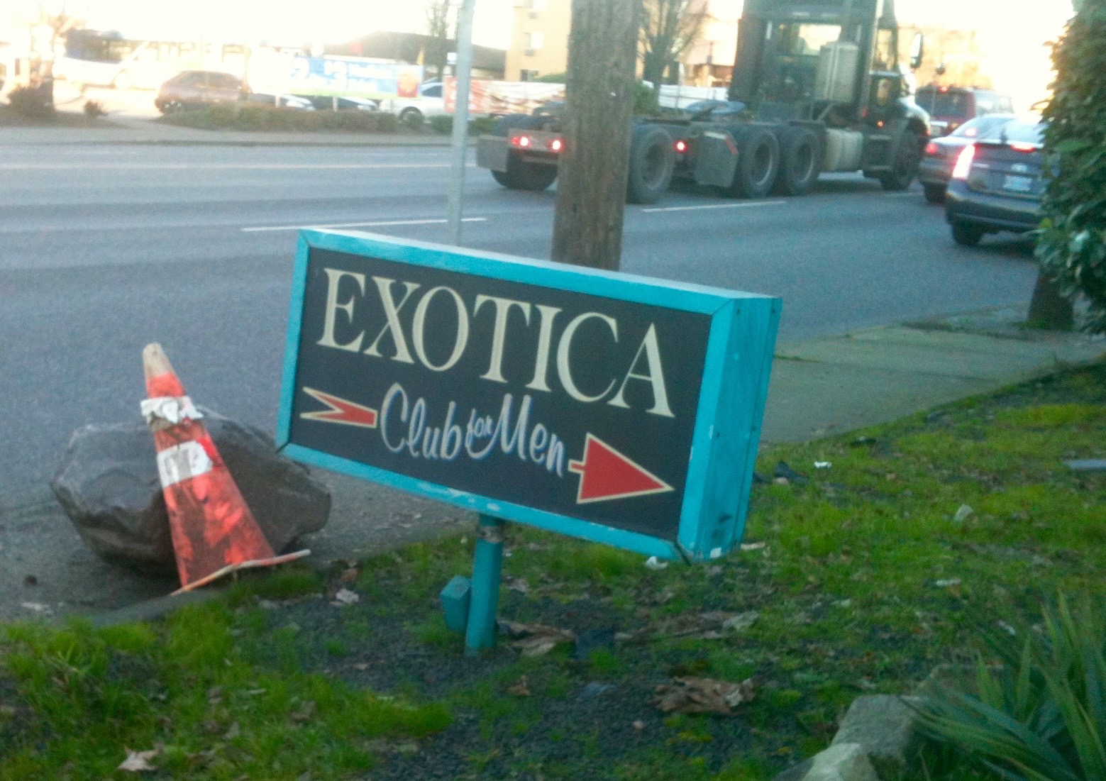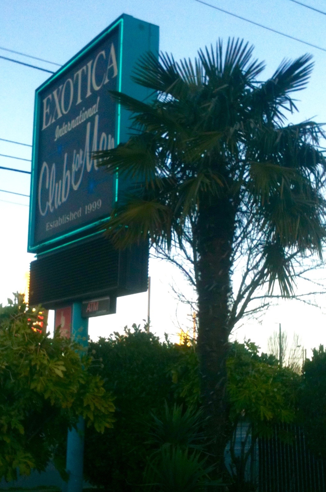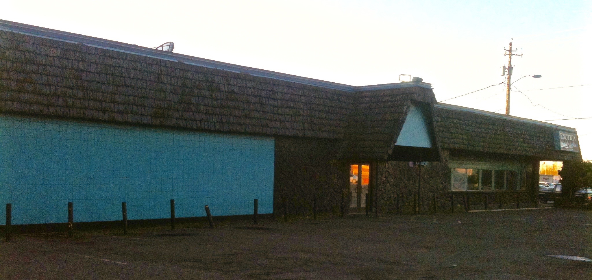 If Exotica International Club for Men could talk it would say, “rumors of my death are greatly exaggerated.” This is what I found out after riding my bike through the glassy sidewalks along Columbia Boulevard to arrive in the empty parking lot. It always looked like a classy place in passing. Then again how much class can a business retain when its nearest neighbor is a Jack in the Box restaurant? I was always attracted to the exterior decor. The dark stone mixes well with the odd shade of blue. I was struck by the attempt at what I’d call tiki-exotic. I was never inspired enough to succumb to the temptations inside that would have led to an inspection of the interior design. Upon further review while visiting the site, I spied a note that stated that Exotica was closed due to repairs and maintenance. It seemed a safe bet to conclude that an empty lot and a for sale sign meant it was shut down for good. It all feels better to be able to report that a repaired and refurbished Exotica International Club for Men will return some day.