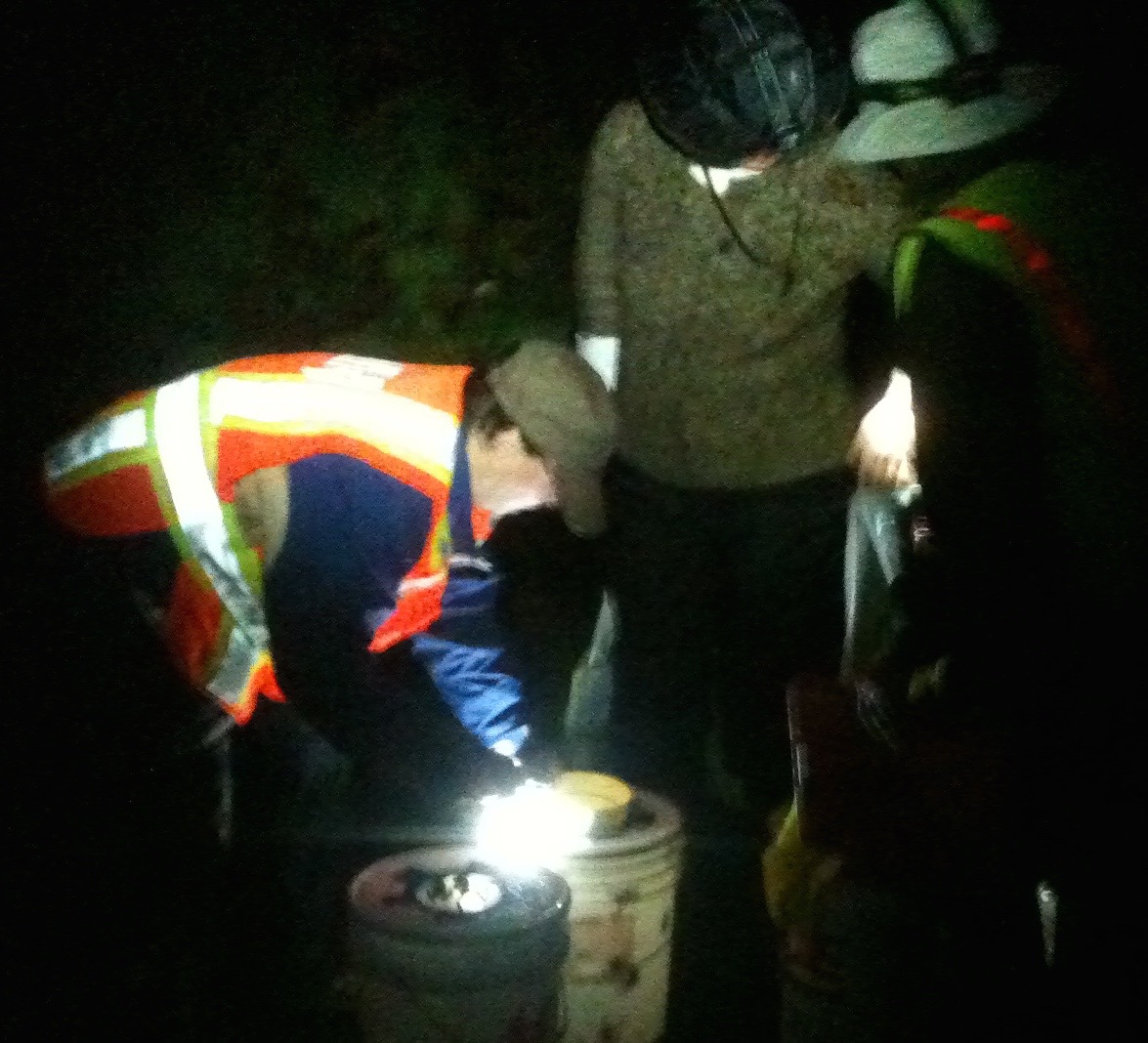 An initial orientation meeting at the Linnton Community Center about volunteering to rescue frogs was an eye opener. I was introduced to the plight of the Northern red-legged frogs who need to get to the wetlands from the hills past Linnton, specifically in the area of Harborton Road. The barrier is four lanes of treacherous highway. Years ago after discovering that frogs were unable to reach the wetlands safely, a group organized volunteer crews to help save them. They now meet seven days a week in the evening during the migration season which generally runs from December to March. The conditions for frog migration have to be just right. Frogs head to the wetlands for mating and egg laying on rainy nights when the temperature is above 45 degrees. My wife, Ronna and I signed on to volunteer for the Friday night shift. We waited seven weeks until conditions were right. On a rainy night in February we headed to Harborton Road which runs up a hill off the highway on the outskirts of Portland.