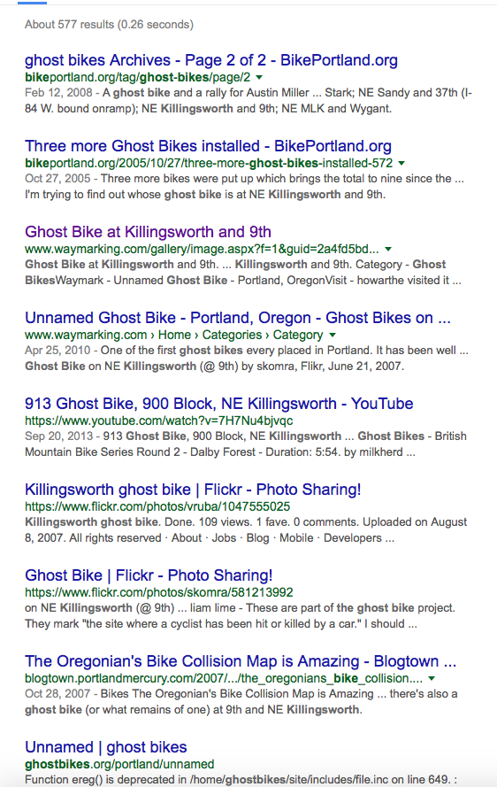 Wikipedia talks about the bikes being set up as roadside memorials where cyclists have been killed or injured. The Willamette Week, in an article from October of 2005, mentioned that the ghost bike project in Portland was started by Forrest Burris to honor his brother Christopher who had been killed on Martin Luther King Blvd. Of course anything and all things bike related are well covered by BikePortland.org. I admit this was about as much research as I was willing to do. I don’t want to associate a name and details with the ghost bike on Killingsworth. It makes that much more intense.