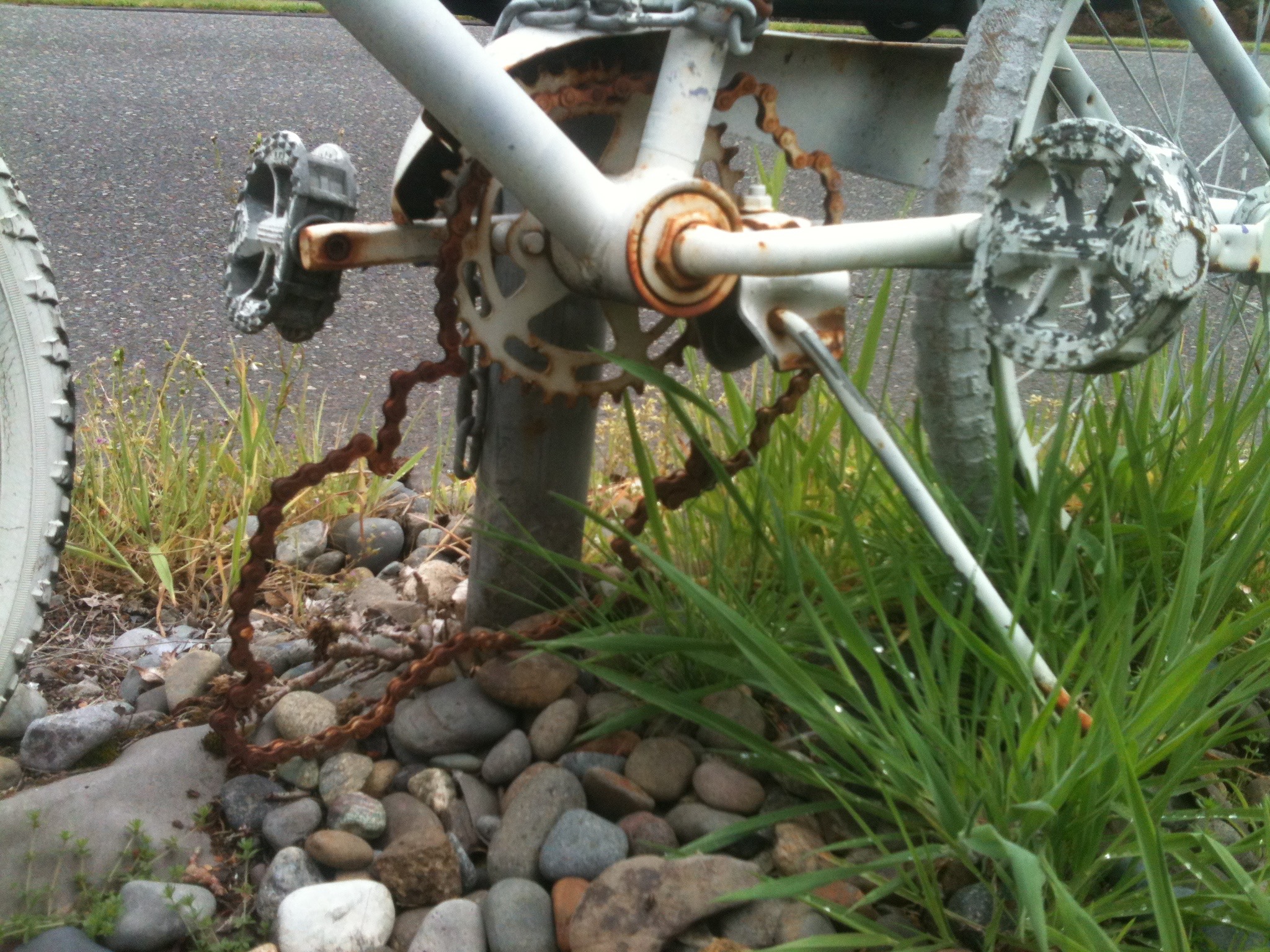 While looking online for ghost bike information, I was struck by a link that led to a list of people who had been killed on bikes in Portland. It was a stark reminder of the risks of cycling. It had me considering the need to read and obey stop signs and be careful about pulling into and riding with traffic. I hope it makes me more aware of bike riders when I’m driving. The ghost bike is a bit like that “there but for the grace of God go I,” saying. I have to remind myself to steer clear of becoming a roadside memorial. Looking at these pictures I took last spring has the ghost bike doing what it’s supposed to do. It haunts me.