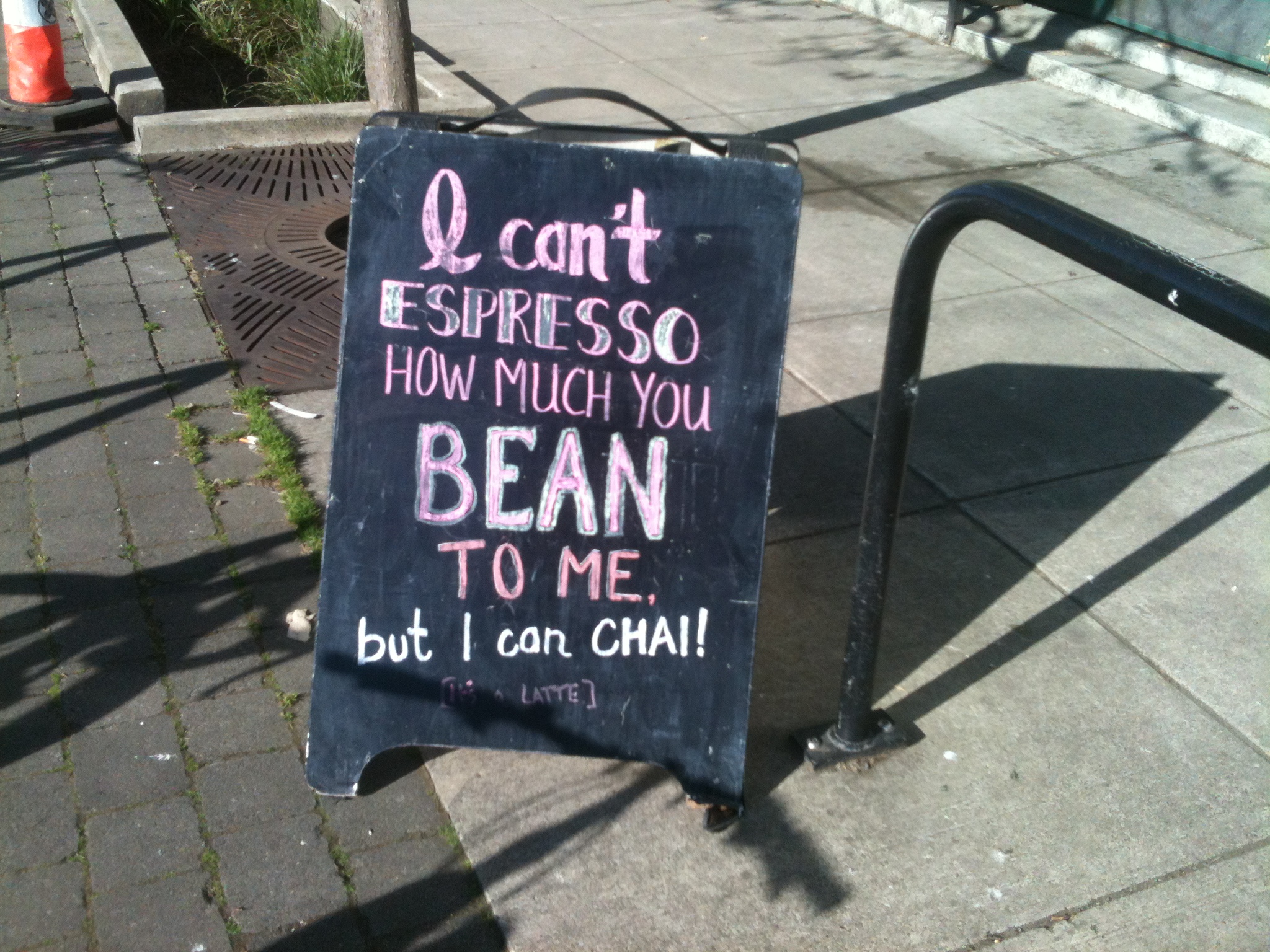 A sandwich board outside of Posies goes for the gold. In fact, I just caught the last pun by studying my photo extra hard. The message ends with, “It’s a latte” and it is a lot to take in. To translate, the sign says: “I can’t express how much you mean to me, but I can try. It’s a lot.” By now you know how puns work so you’ve, or I have, figured out that the keywords are words pertinent to coffee shop nomenclature. It’s a colorful sign too. It inspires me to want to drink expresso, coffee and possibly a latte. I’ve never been much of a chai person.