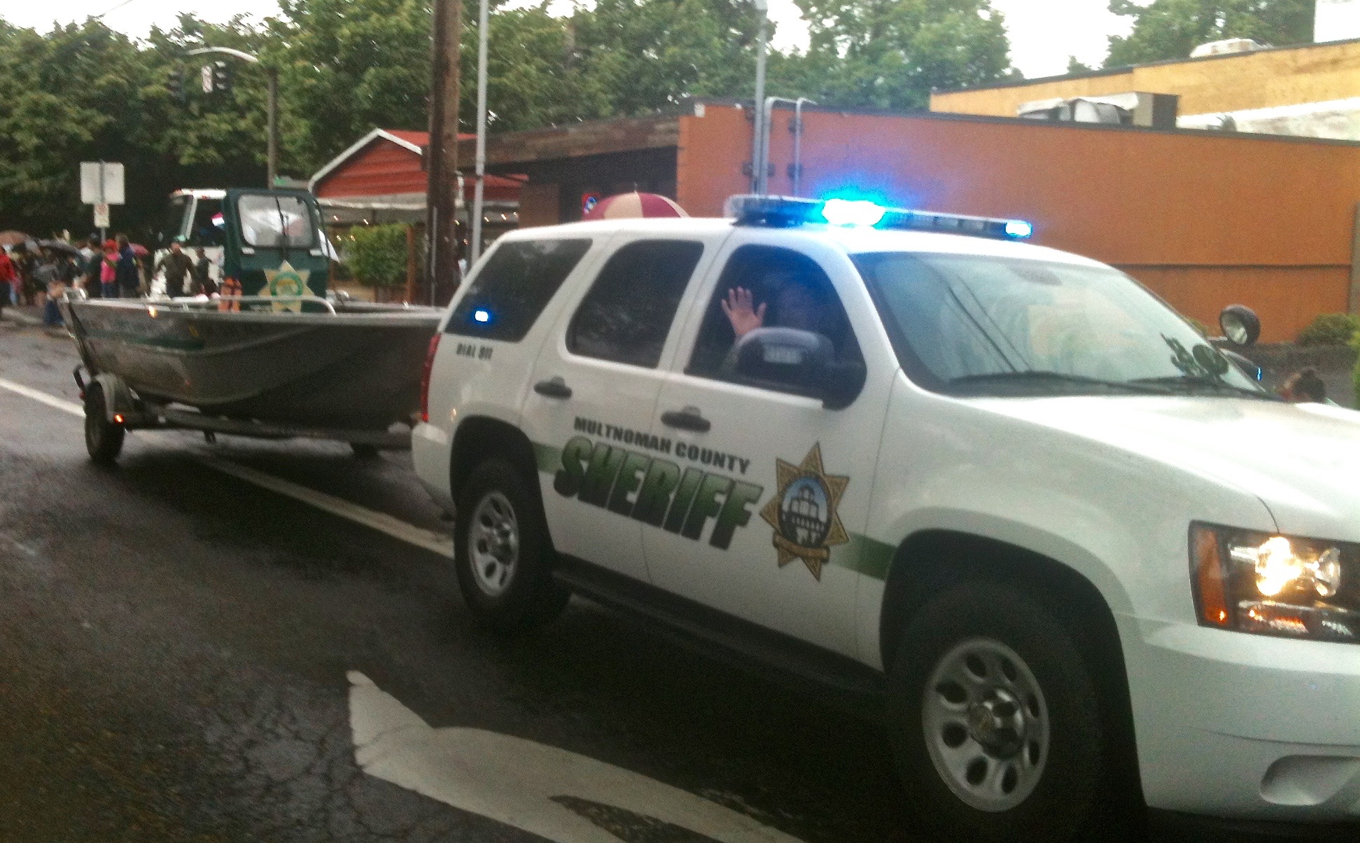 After seeing so many old cars and a couple of dune buggies, I got excited about seeing of all things—a boat! The Multnomah Sheriff’s department dragged along a river patrol boat. My transportation topper was Teeter Roofing and their gang of ATV riders, something you don’t often see at parades.