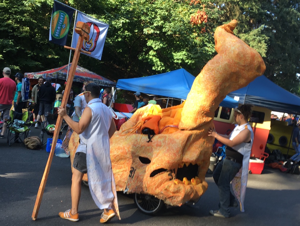 While walking through the pre-race area, I overheard, “At some point, it would be nice to have a cute little car that’s easy to unload.” This didn’t seem likely as the cars I saw were large and complex, some with multiple riders and they all had to be hauled up Mt. Tabor. Walking through this area was a blast. People milled around chatting and taking photos while teams were getting their cars ready. I enjoyed the outlandish car designs and costumes that fit the car’s themes. One participant, who had one of two New York City subway inspired cars, described his vehicle as a tribute to the world’s greatest living museum, the NYC subway trains of the 70’s, 80’s and 90’s, when they were covered with graffiti. People’s enthusiasm for the PDX Adult Soapbox Derby was infectious.
