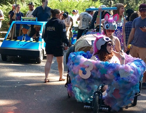 The inspector had one more look at Dash’s brake addition seeing if the wheel would stop as people pushed the car. I was amazed by Dash’s dedication and willingness to drive his car without foolproof brakes. “I can’t give you a go,” the inspector said. They shook hands. Dash accepted the disqualification. “It’s gonna be a good day regardless of whether you’re racing or not,” he said. Later he offered his services as a driver to a neighboring car, hunted down some screws to help another team and loaned out his bike pump.