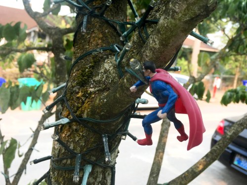 Helplessness is not a trait I like to see in my Super Heroes. They’re strapped down by the decorative Christmas lights. While cheery and soothing at night and in season, they now appear menacing. Superman seems the most active as he thrashes away at unseen gamma rays in hopes of freeing himself.