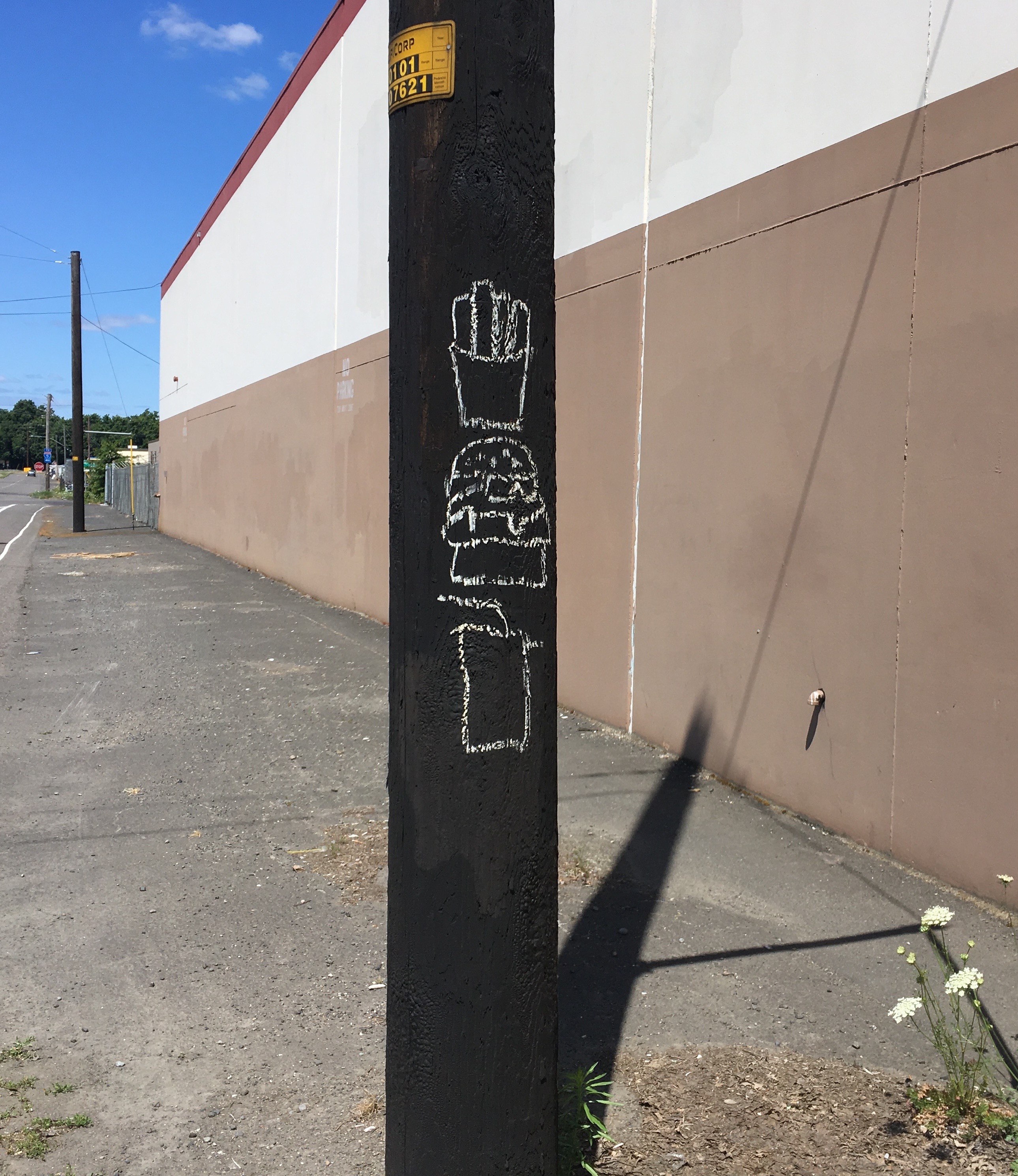 The fast food art of an obvious fast food enthusiast appears as graffiti on traffic signs around town. It caught my eye on this pole near the Portland Meadows horse track. What looks like a simple chalk drawing applied to a utility pole creates another example of, you guessed it, Pole Art. Are these images modern hieroglyphics, subliminal advertising, the eye-catching subject matter of unwarranted public art, all, or none of the above? Consider yourself lucky no multiple choice test is involved at the end of this Pole Art blog post.