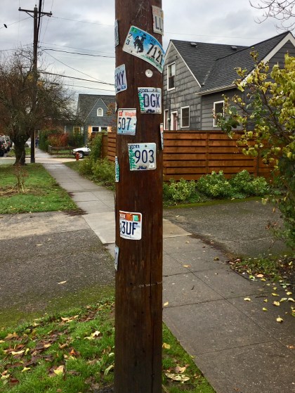 In case anyone is wondering what to do with the license plates that pile up in the garage and seem like souvenirs from all the places you’ve lived but are really a heap of colorful metal gathering dust, this example of Pole Art in the Arbor Lodge neighborhood might be the answer. It’s fun to look at adding color, geographical information and various letters and numbers to otherwise drab surroundings.