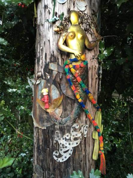 In response to seeing a Facebook posting about last week’s Pole Art piece, April asked if I had seen this Pole Art. It was new to me. Initially I thought it was fantastic. Well, it is, but I had been under the impression that it was a piece of original art attached to the pole. A closer look revealed that it to be more of a found art conglomeration. It’s still striking and skillfully arranged. Discussion followed about where this Pole Art was located. I feel it’s important to let any possible Pole Art aficionados know in case they want an up close and personal viewing. This art was spotted last spring so at first the recollections were spotty. It was narrowed down to Butterfly Park before iPhone technology saved the day offering the more specific location of SW Miles Place.