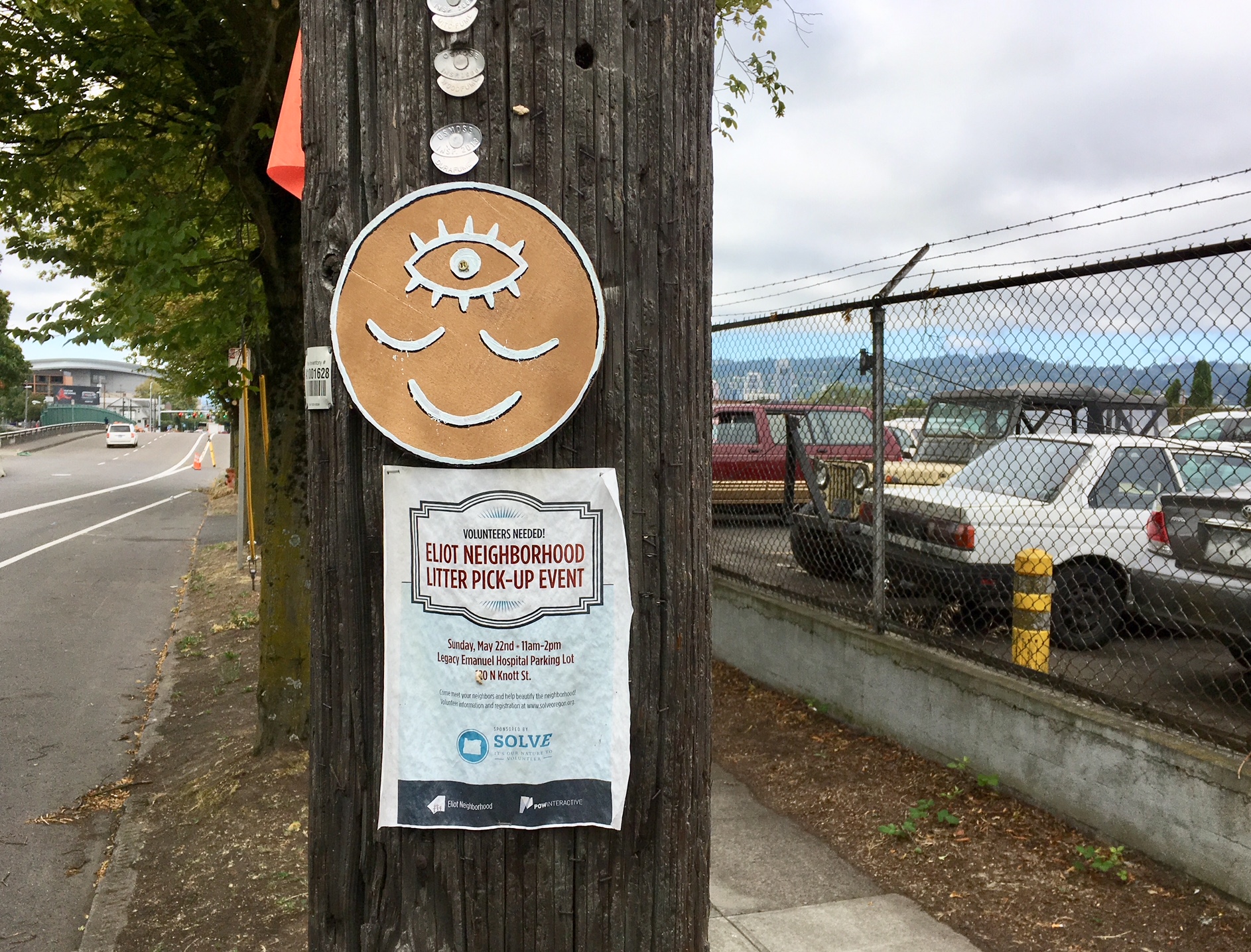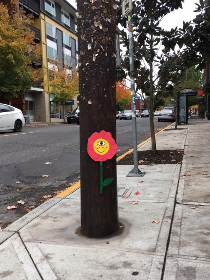 Here are two examples of a design that can be found all over town. It’s not only seen as Pole Art but on stickers too. In faces and flowers we see the wide open third eye keeping watch for the rest of a face reflecting total bliss. These decorations were found in the North Williams corridor and they seem to be offering something in the way of brightening up the days of passersby.