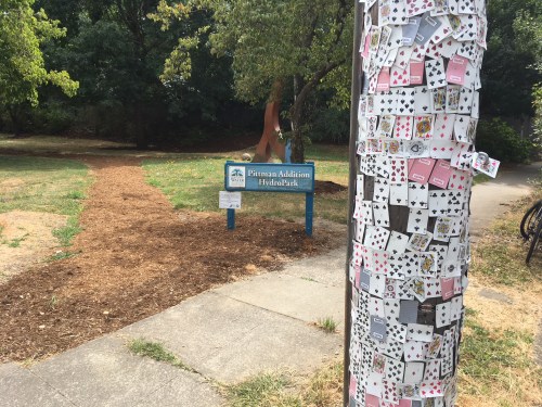 Right at the entrance of Pittman Addition HydroPark is a pole covered in playing cards. This was the case this summer anyway as it’s hard to tell how many card games have since broken out in the park. The cards may have been pilfered by now. The immediate reaction may be how much of an artistic statement this is. People might be thinking it’s just cards attached to a pole. What the concept lacks in artistic merit it makes up for in fun and spectacle.