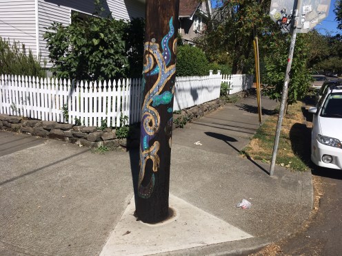 A swirling seascape of fish, colorful bubbles and kelp slithering up this pole in the Sunnyside neighborhood has the feel of a hippyish, paisley, old tie design. A little paint creates Pole Art bursting with life, vibrancy and color on an otherwise baron utility pole. I appreciate the efforts to jazz up this neighborhood.
