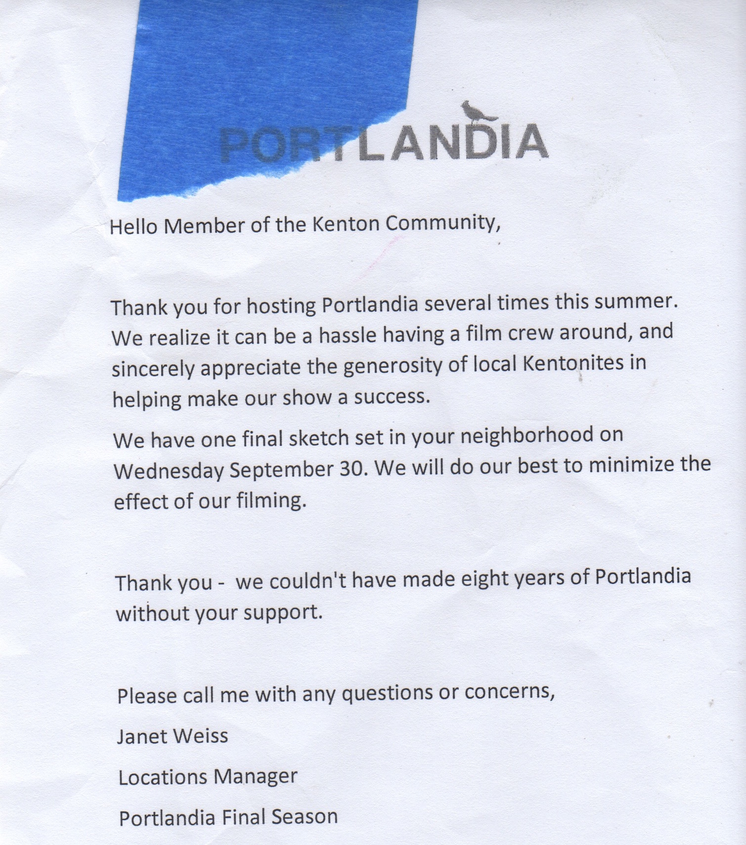 Last August a notice appeared on the door. Taped up with blue painter’s tape, it informed us that Portlandia would be in the neighborhood shooting one last time. The notice included a nice note that was signed by Janet Weiss. It took me a second to realize that this was, the Janet Weiss, Carrie’s bandmate and that she was also working for Portlandia. The fanboy in me wanted to call the phone number she included but I don’t really want to bother anyone.