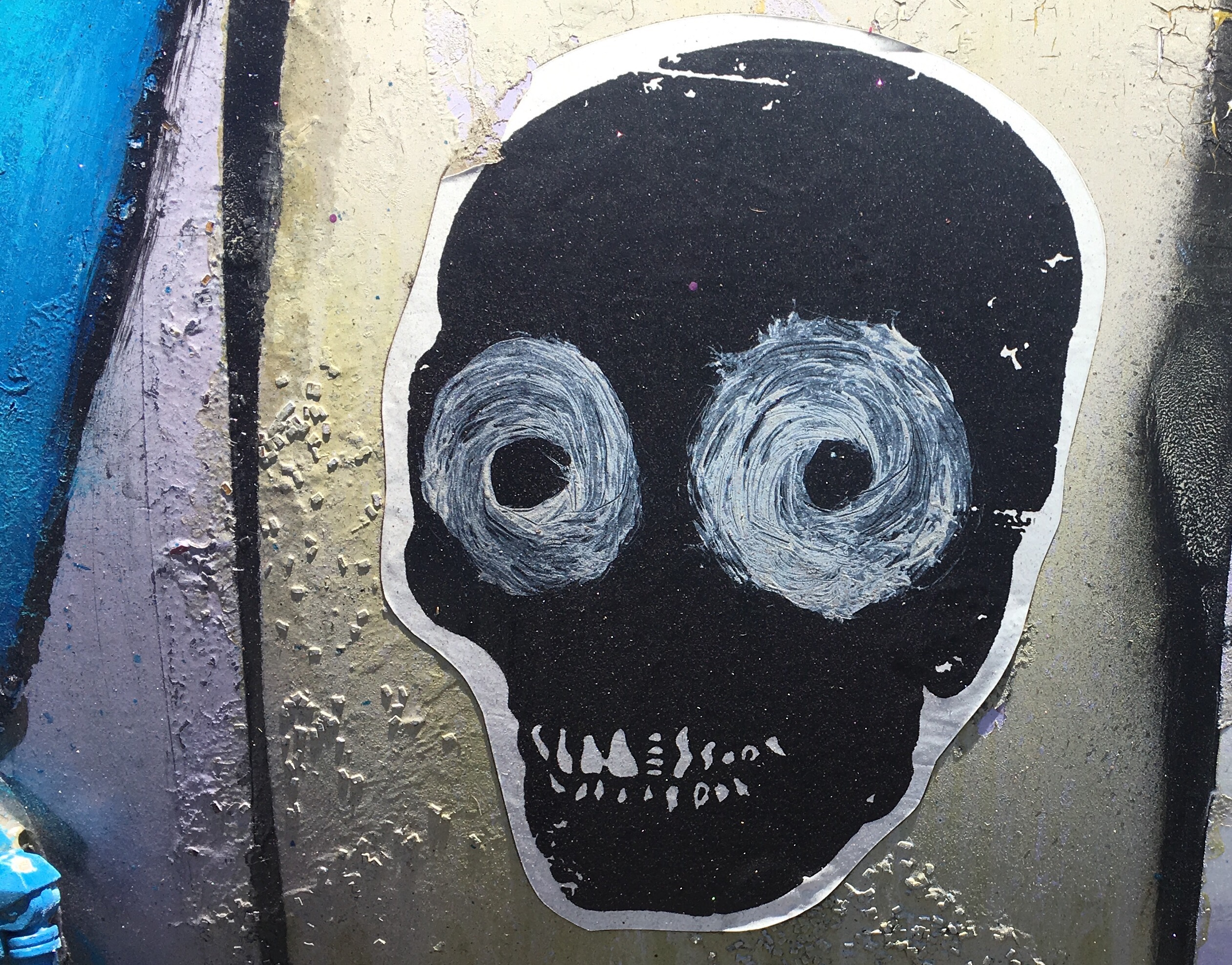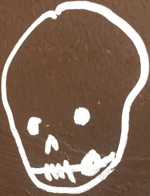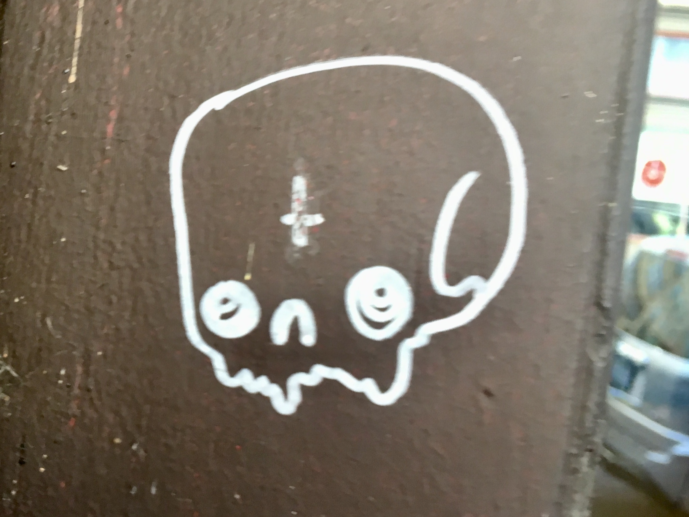 Rough looking skulls take on the appearance of head bones that have been kicked around a while or stacked up in catacombs for centuries, especially when they look like they’ve been painted with white out. It’s was the subtle placement on an East Central Industrial area furniture store doorway that caught my still intact eye.