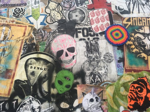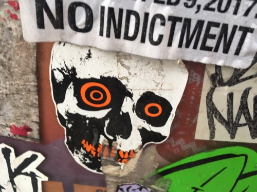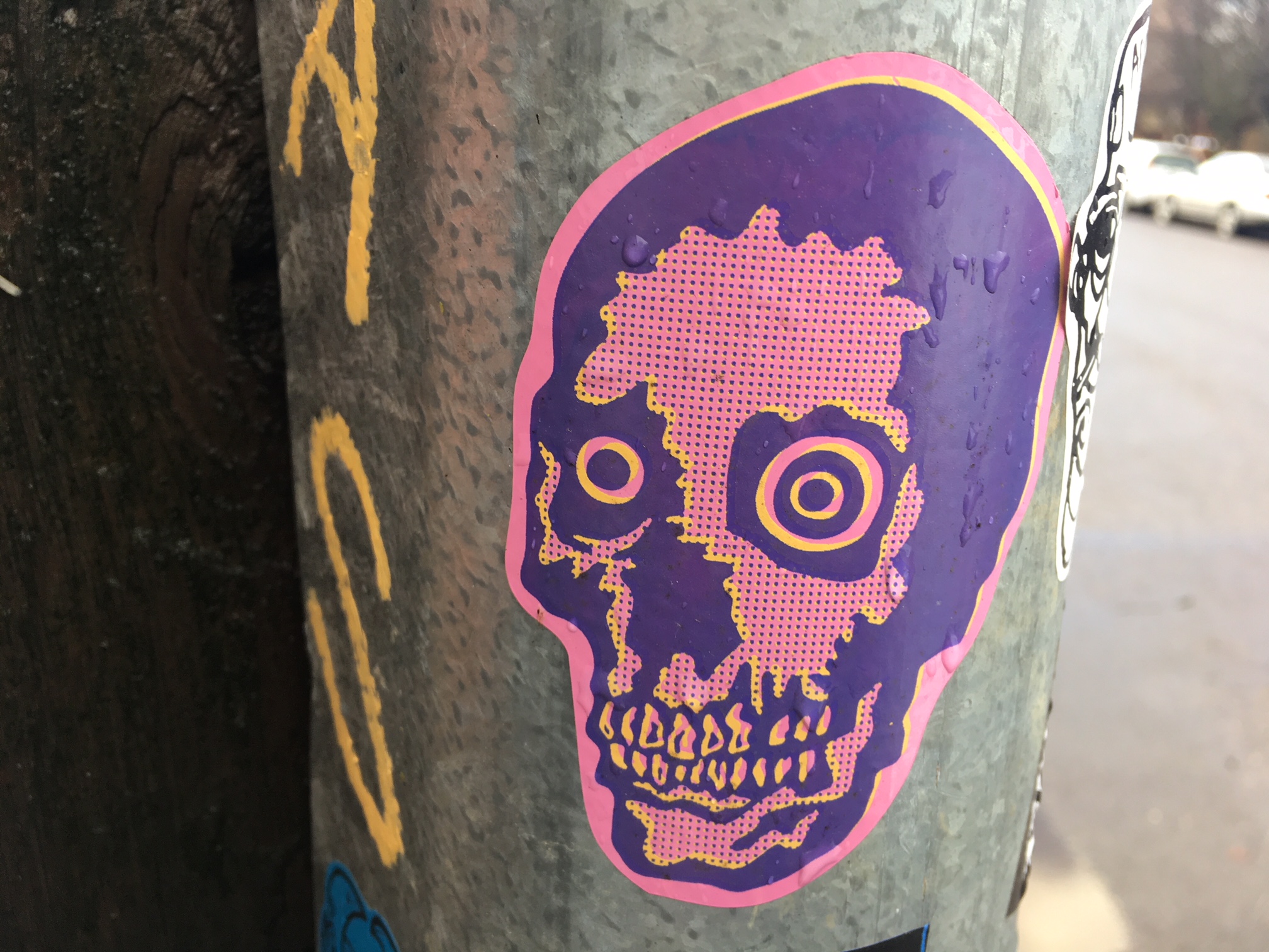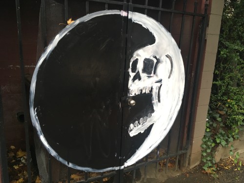 A temporary memorial, it’s since been painted over, sprung up around the time of Fred Cole’s passing on a metal door gate on N Albina Street. I didn’t realize it was a Dead Moon album cover reference at first. Some street skulls have significance. It’s a shame this one didn’t get a chance to live on.