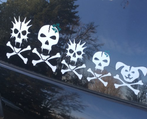 Annoying family stickers get the skull treatment which is way less annoying yet still annoying in that family sticker on back windshield of a car way proving that skulls can’t make everything cool.