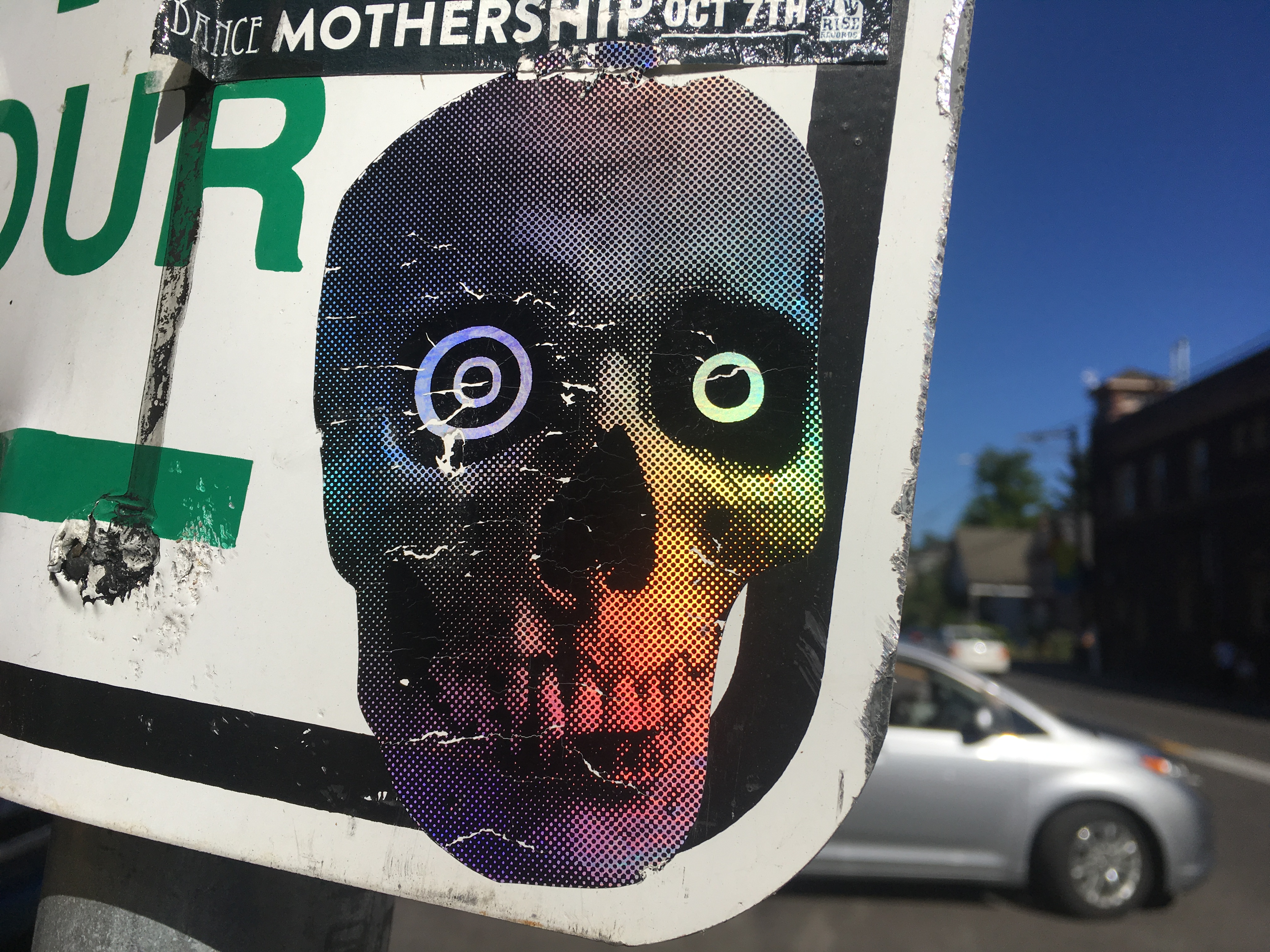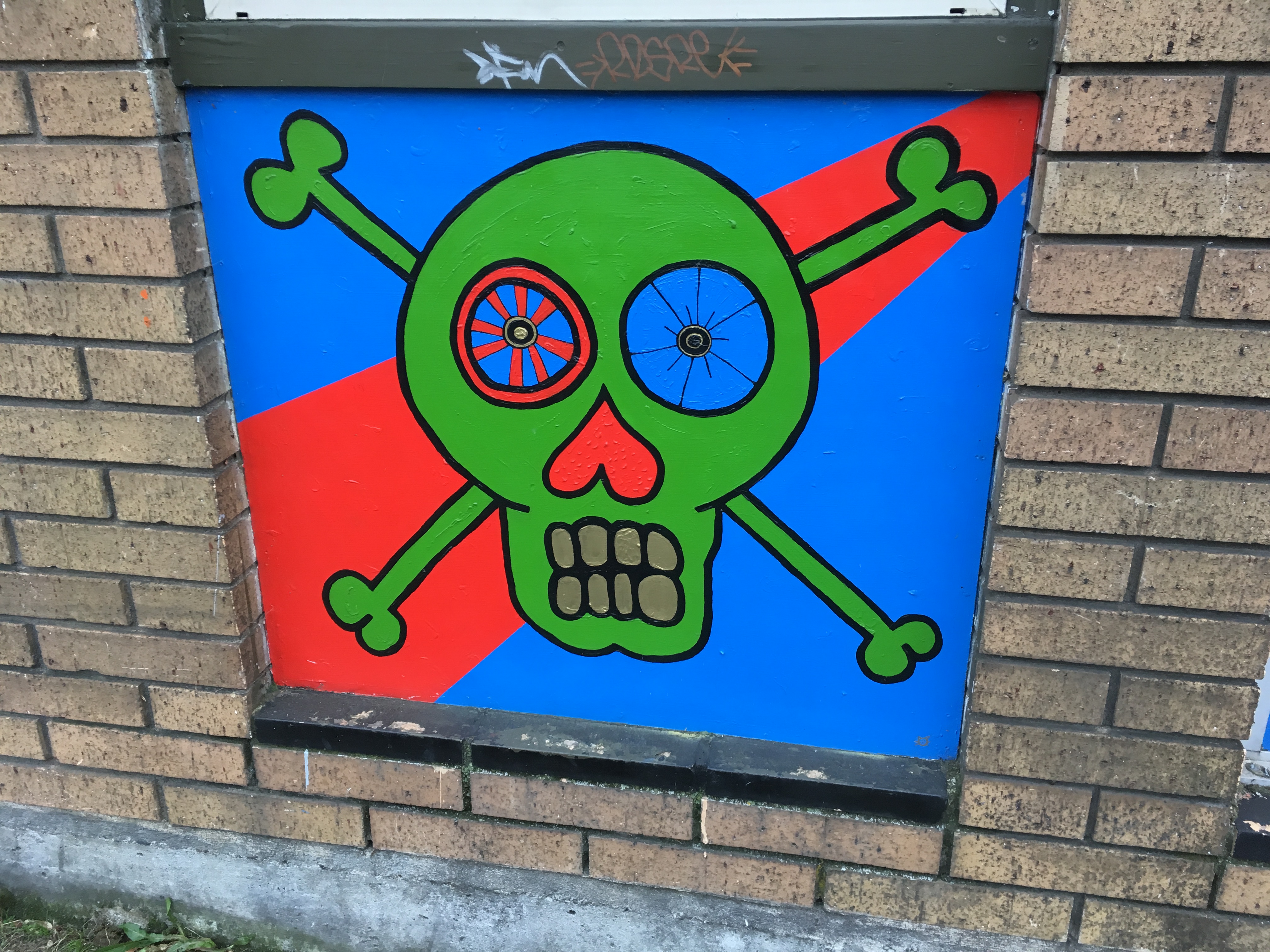 The colors are vibrant, the eye sockets look like bike tires and while it’s more skull and crossbones than solo skull, the psychedelic, folk art nature of this piece seen on Hawthorne Boulevard knocks my socks off.