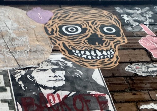 Another view of various skulls mixed in with other cultural referencing forms of street art.