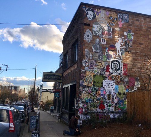 The whole side of a building has been taken over by various skull images on N. Mississippi Avenue.