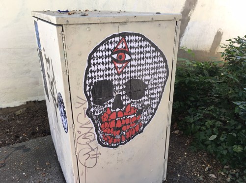 A skull with a third eye and four rows of teeth transforms this transformer box on SE Division Street into a roadside Skull Art kiosk.
