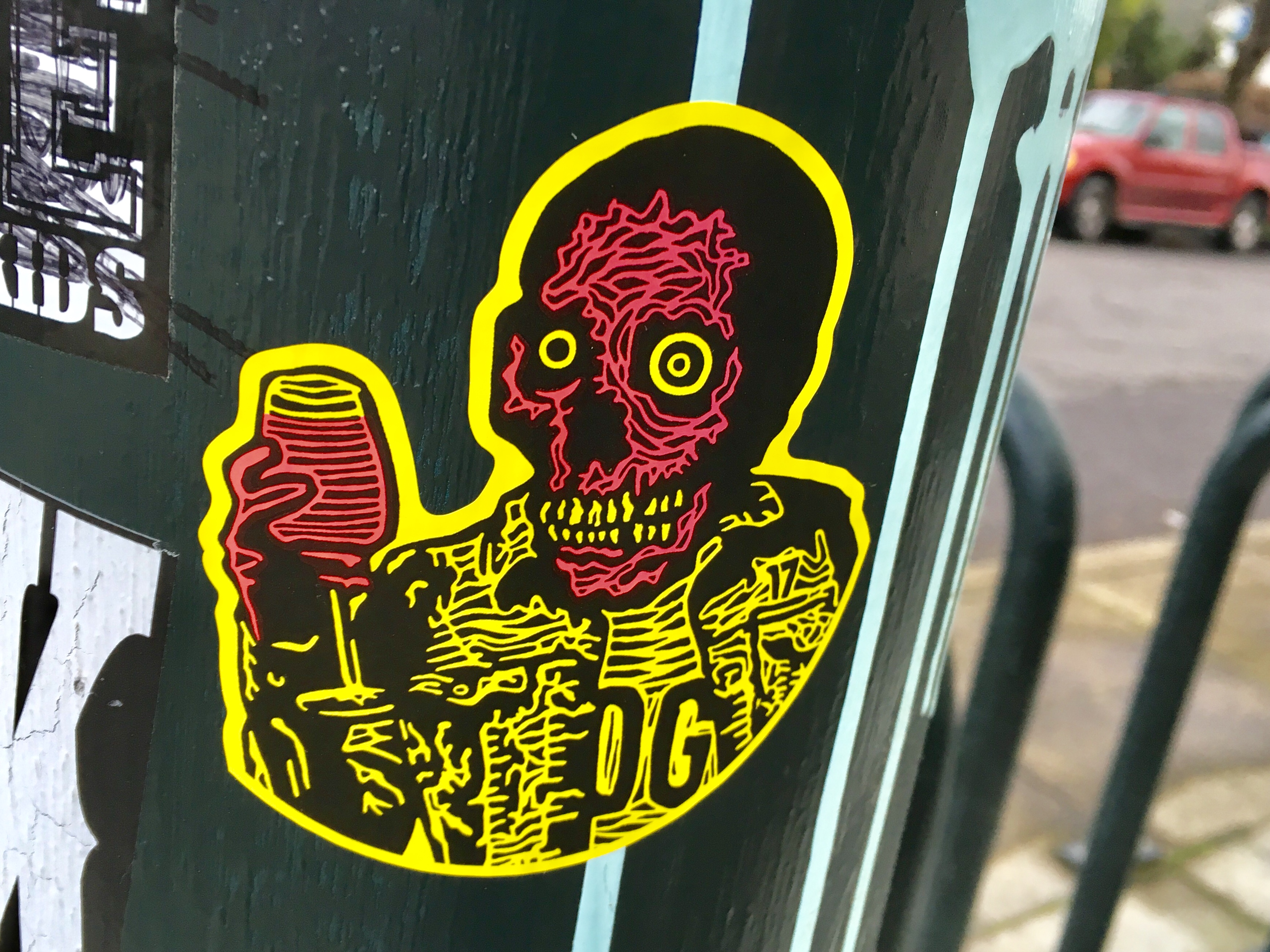 Hyper realist (look at those teeth!) and reflective, this sticker creation seen on SE Hawthorne Boulevard has the added bonus of taking on different colors depending on the viewing angle.