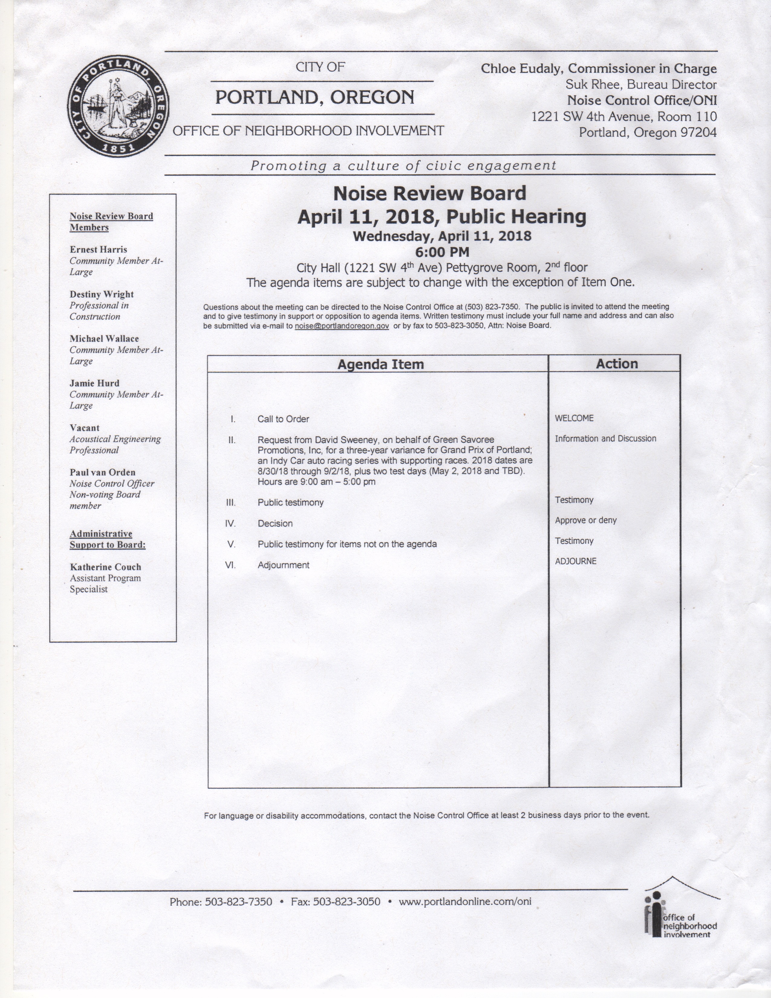 My interest in the meeting involved the sole agenda item concerning noise levels at the Portland International Raceway. I live near the track. For the most part it’s a live and let live kind of thing. The sounds don’t bother me. Race fans have that need for speed and the voice calling races through the P.A. system creates a feeling of an unknown nostalgia for me when I hear it at our garden plot. At this meeting representatives of an upcoming race were asking for a variance for noise levels. As explained on the City of Portland website, a variance is “for activities that make more noise than our Noise Code allows.” I had recently downloaded a decibel app on my phone which came with a handy chart. My curiosity piqued when I saw that the 115 decibel levels they were asking for are comparable to a rock concert. Beyond that I wanted to know who attends Noise Review Board meetings and see the board members. I imagined them wearing industrial headphones for some reason. None of them did. Other answers I sought related to finding out would happen if noise levels were exceeded and how the sound was measured. I caught the opening remarks of David Sweeney, representing the race promotions company and heard him talk about how excited people would be to have Indy car racing back in Portland and the boost the race would offer the local economy. He discussed how the noise levels would be controlled. Cars exceeding the levels would be taken off the track for adjustments. He explained that test days helped determine the types of tires that would be used in the races.