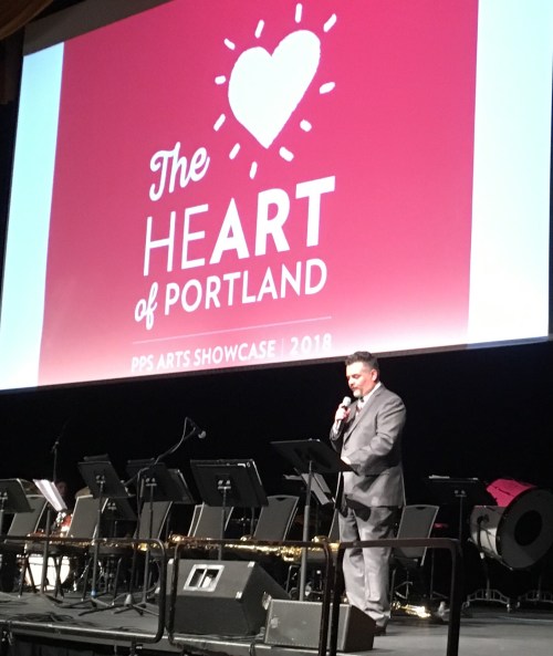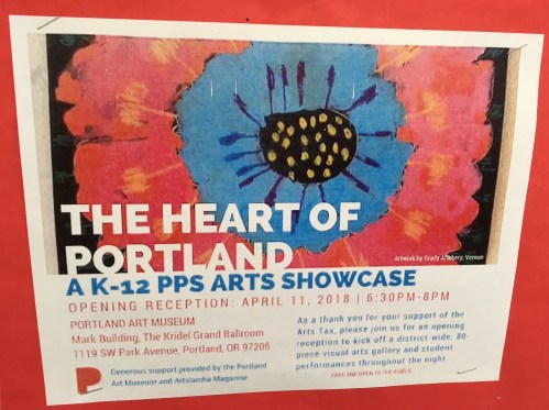 Arriving at the event space at the Portland Art Museum, I was surprised. The place was packed. Not expecting mobs of art enthusiasts, I weaved through the crowd as the school system Superintendent spoke in the museum’s third floor ball room. He sounded official, enthusiastic and supportive. I was inspired but not sure what to do about it. A video showing drama students going to Seattle to see Hamilton followed. Then more Hamilton. A student stood on a separate stage busting out a Hamilton-style Paul Revere rap. It was as educational as it was engaging but I was in Hamilton overload. Where was the food? This crowd, there were too many people to feed. Heading over to a side wall I spotted the spread on a small table with items covered in cellophane. There was not enough food to feed me much less the massive gathering. Once the food was ready I restrained myself. It wasn’t going to be fair to hog humus. I chewed and stewed then realized I needed to see the art–the fruit of the Arts Tax. The Grant High School Jazz band began. They were hopping. They played me off as I exited for art.