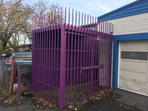 If I had to be kept outdoors in a cage, I’d hope it would be this one spotted off Columbia Boulevard. This purple spruces up the exterior and interior of this impenetrable contraption.