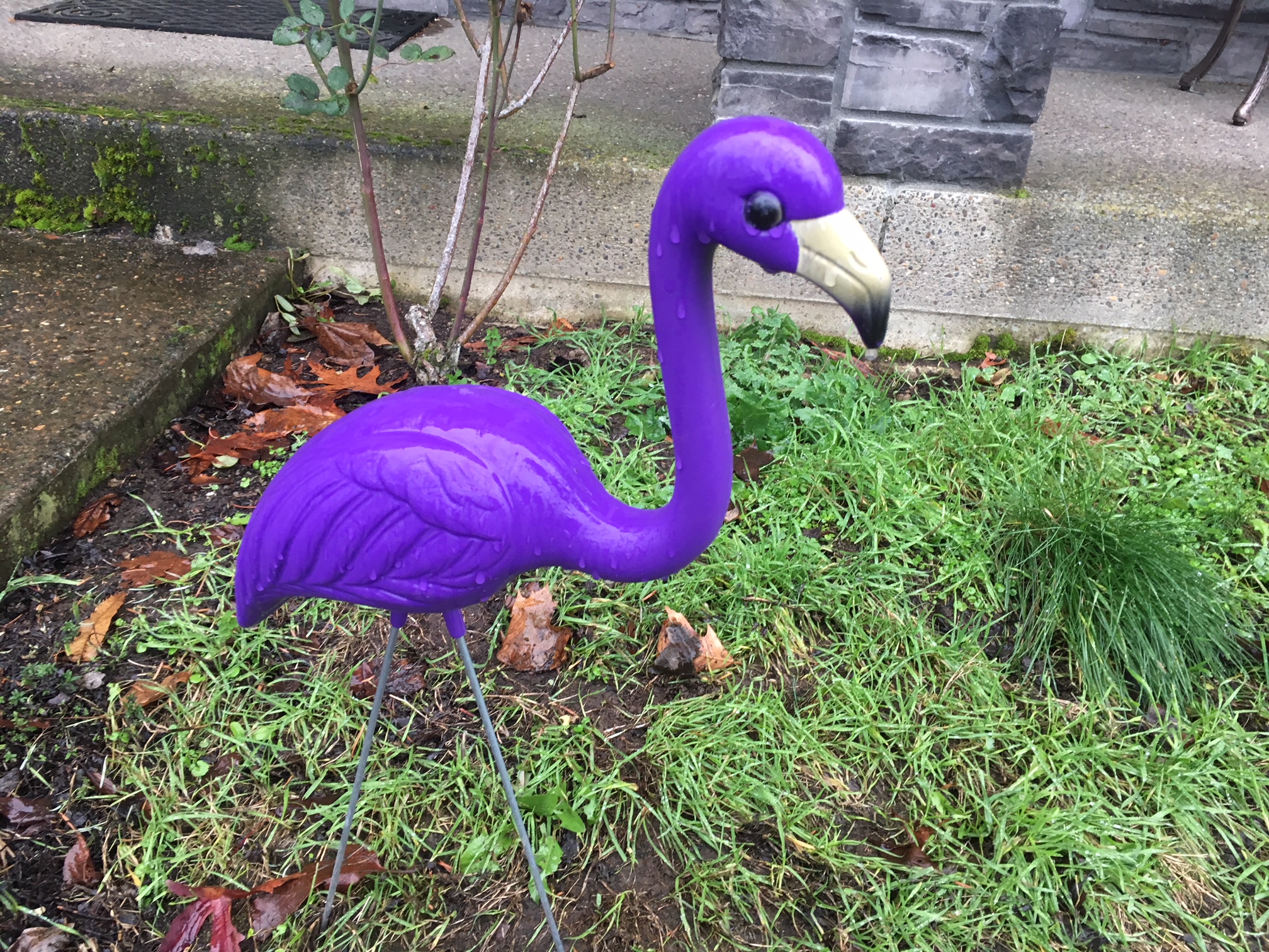 I had never considered, nor thought about, the idea of a flamingo being purple until I saw this North Portland species. All flamingos, living and plastic, should be purple. I haven’t figured how this could happen but it should. These gallant birds wear purple well.