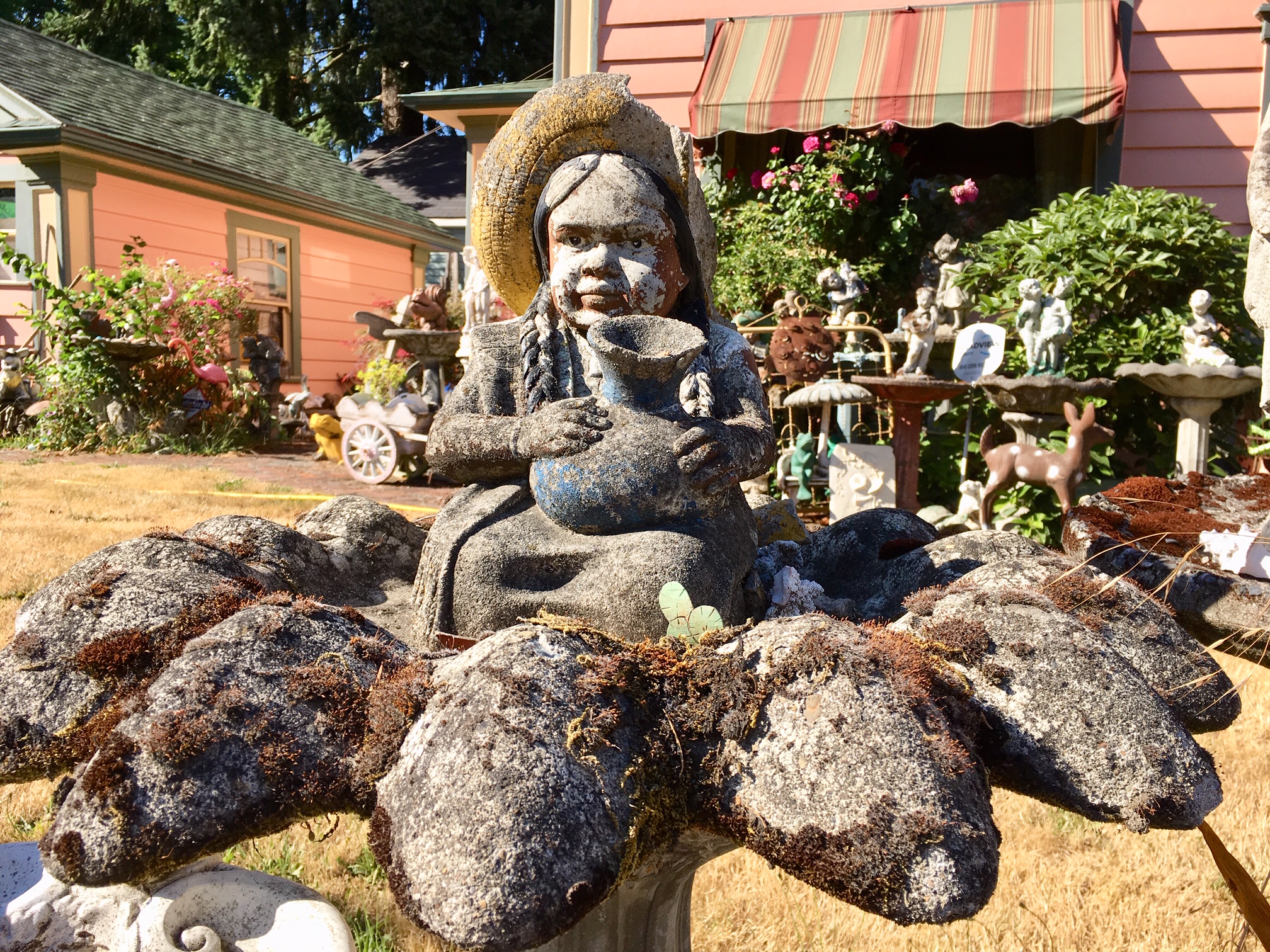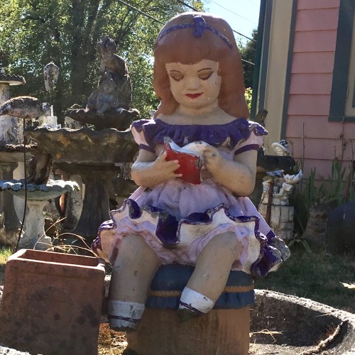 I can only wonder what birds think of the yard. The baths didn’t exactly teem with life. No birds were spotted. The birdbaths didn’t appear to contain water. Other signs of decay included dried plants and worn out statues. One figurine, absorbed in a book, remained oblivious to her feet having crumbled and fallen off. The volume of ceramics, figurines, statues, knickknacks, birdbaths and cement that combine to form this bastion of over-decoration overshadows what probably was never intended as a bird spa anyway.