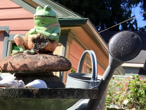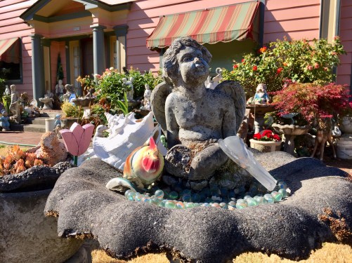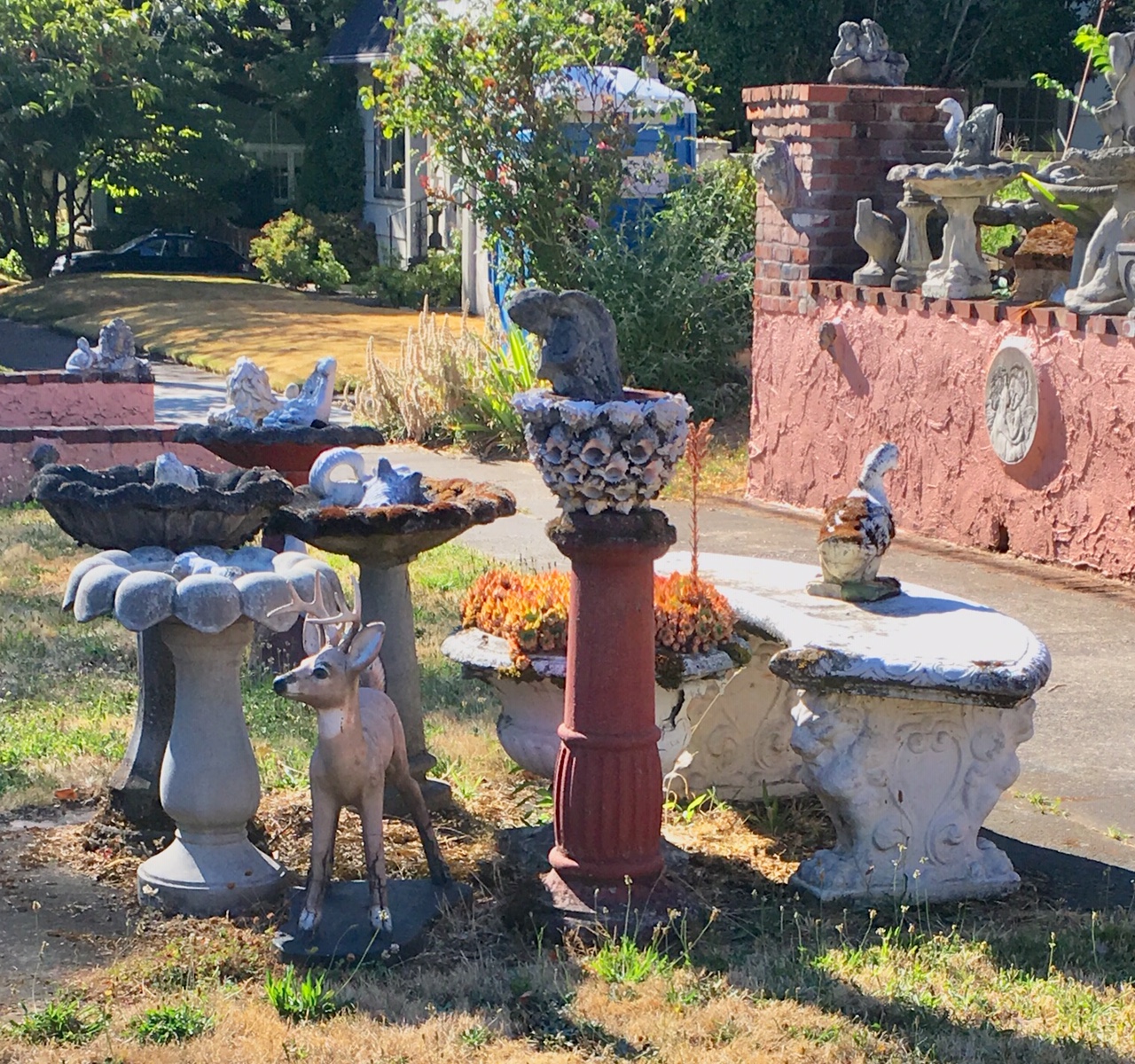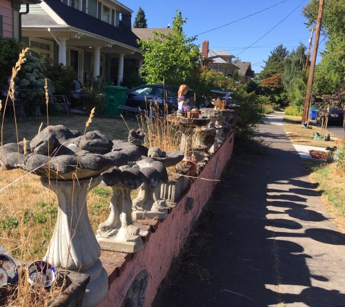 Even before the first day of this February a funk settled over me so deep it would have made James Brown envious. January ended with two days of winter sunshine and I couldn’t take it. Cold gray skies have slithered back that may bring a wintry mix allowing me to get back to daydreams of real sunshine emanating from the cloudless blue skied August afternoons like the one that had a friend and me stumbling upon an overly decorated, yet endlessly fascinating explosion of birdbaths in the Laurelhurst neighborhood.