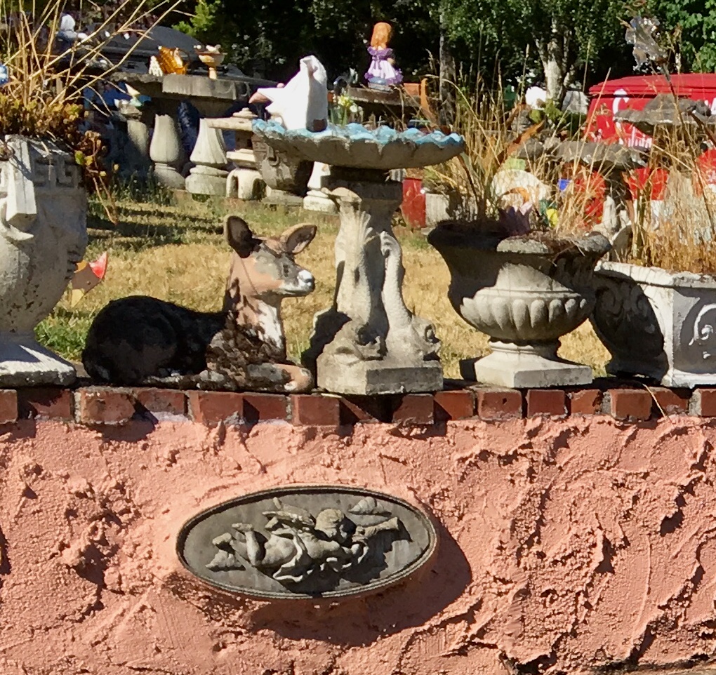 I know next to nothing about the origins of this superb example of birdbath mania. It’s possible that things have changed drastically since I last saw it a year and a half ago. It’s even more likely that it remains the same except for slow decay from time and weather. Neighbors could either see it as a source of pride or annoyance. It would take some organization to rid the neighborhood of what the unenlightened might consider an eyesore.
