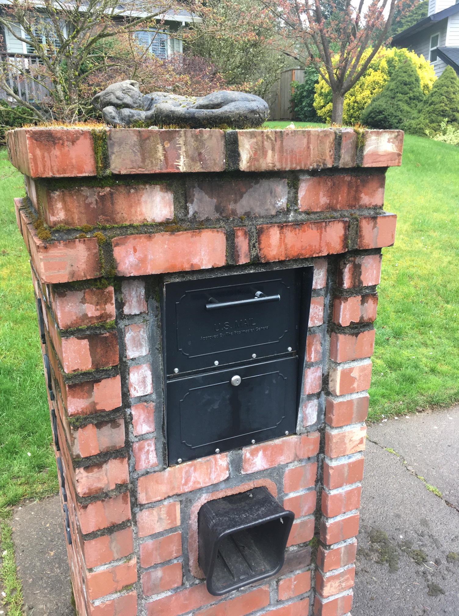 Of course I missed the operative question but the man seemed to be in a rush to get his mail and get back inside. I’m sure a question about cat ownership would have been affirmed. I don’t know what cat lovers look like but it seemed like he must have had a live cat living at the house with a cement cat topped mailbox at some point. Since I was granted permission, I took photos and headed off to find the next cat.