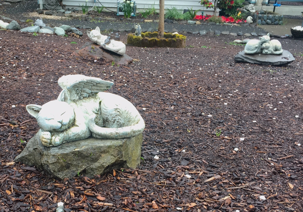 I had come to the streets of Orchid Hill looking for three cement cats I’d spotted on a “forced march” in the month of March. This walk, being recreational and practical, centered around a stop at the grocery store. Walking up Orchid Hill Way and Place, I spotted a trio of stone cats on brick mail boxes. We had stumbled on a street of cat enthusiasts. It still might not have even been interesting enough for a Portland Orbit post but one of the cat topped mail boxes stood in front of a yard full of cat figurines. Through the randomness of it all a pattern emerged. Neighbors found a way to express cat love and for a brief moment, with three families participating, a contagion almost became an outbreak. Then, it stopped. I was on a mission of curiosity to get answers. At the very least I’d be able to marvel at some neighbor’s shared celebration of cement cats.