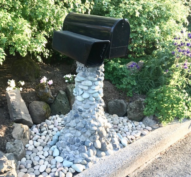 When I feel like I’m becoming a mailbox post critic it scares me. I mean how much actual work is there for this kind of thing. This mailbox is a work of art. It has beautiful, smooth stones and it’s set in a rich landscape of small boulders and flowers. This is excellent cement and design work. Anything to keep a mail person interested in their job.