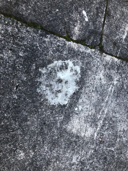 Approaching the neighbor, I had concerns about how I’d be perceived. It’s odd enough to be approached by anyone. My opening was something about whether the man had lived in the neighborhood for a while and if he had heard the legend of buried teeth. He didn’t skip a beat pointing out that they had been underneath a street sign. “They’re gone. Somebody dug ‘em up,” he said. The use of the word somebody may explain why I didn’t ask who dug them up. That didn’t matter because I was hearing they had existed. He explained that they’d been gone over ten years and had looked like a jaw bone. I mentioned what I’d heard, that the teeth had been planted around fifty years ago. He responded that the dark gray sidewalk had looked like they’d been there since the 30’s.