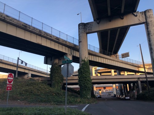 I walked past the west side of the Ross Island bridge, another rumored location. There was no indication besides slabs of concrete in line for an upgrade. I noticed possible cavity fill from whatever industrial dentistry may have been performed to remove dentures that may have been there. As I walked down SW Kelly Street past signs posted about a missing cat named Dexter, I reached the last location, the intersection of SW Water Street and SW Abernathy near Barbur Boulevard. The area was over grown, with sidewalk moss that would have a required a giant toothbrush to clear it away. There seemed little chance of spotting teeth in this concrete.