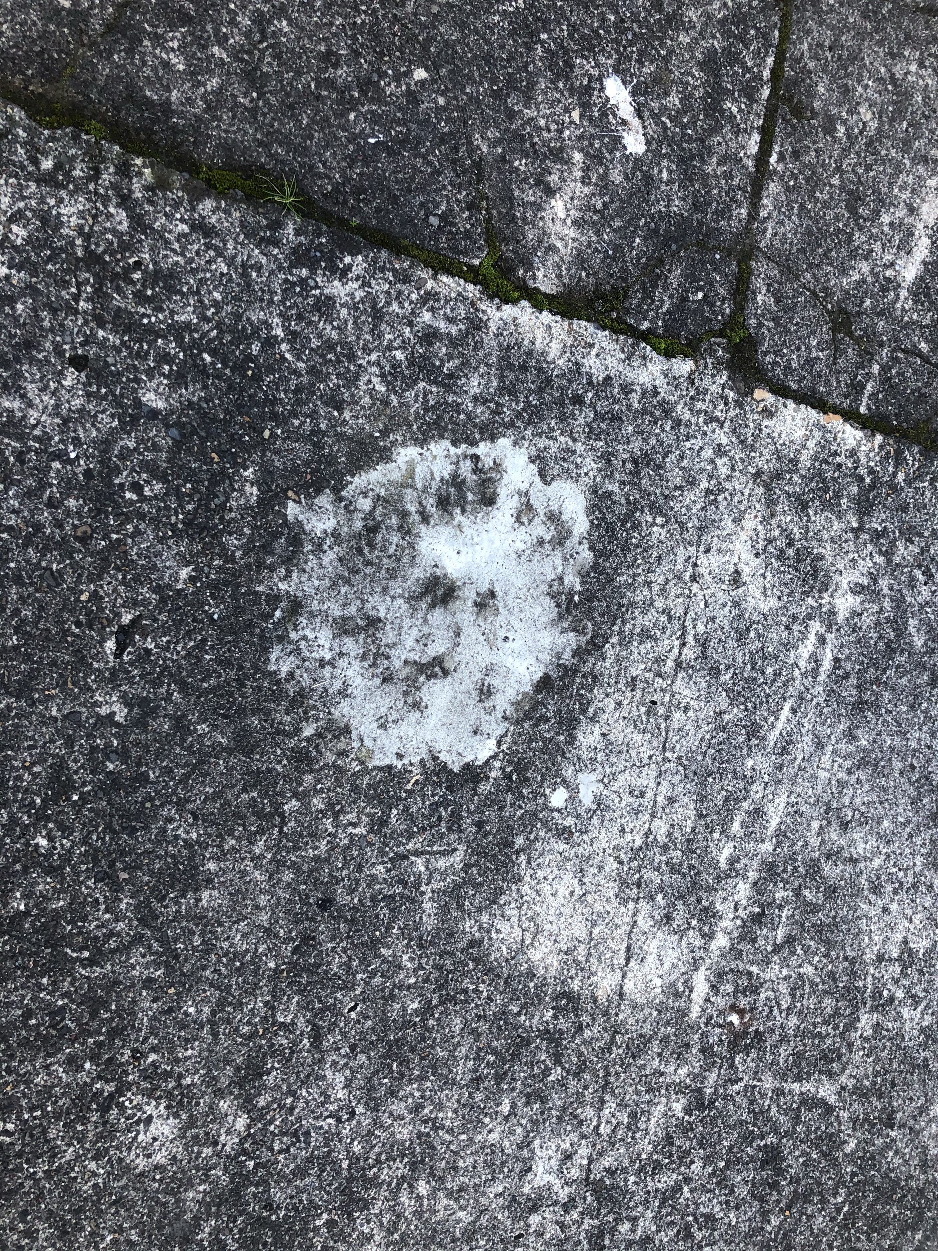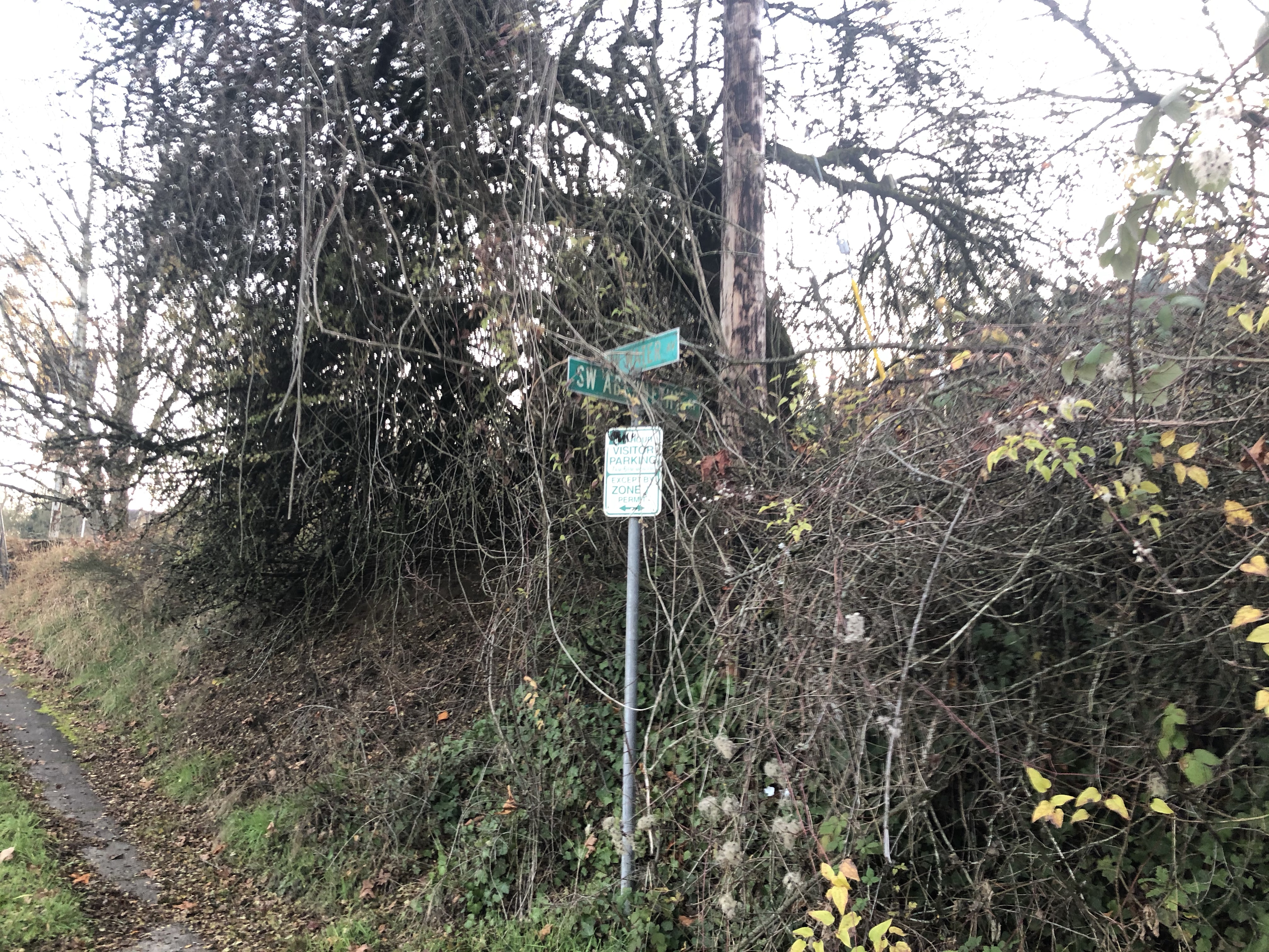 I walked past the west side of the Ross Island bridge, another rumored location. There was no indication besides slabs of concrete in line for an upgrade. I noticed possible cavity fill from whatever industrial dentistry may have been performed to remove dentures that may have been there. As I walked down SW Kelly Street past signs posted about a missing cat named Dexter, I reached the last location, the intersection of SW Water Street and SW Abernathy near Barbur Boulevard. The area was over grown, with sidewalk moss that would have a required a giant toothbrush to clear it away. There seemed little chance of spotting teeth in this concrete.