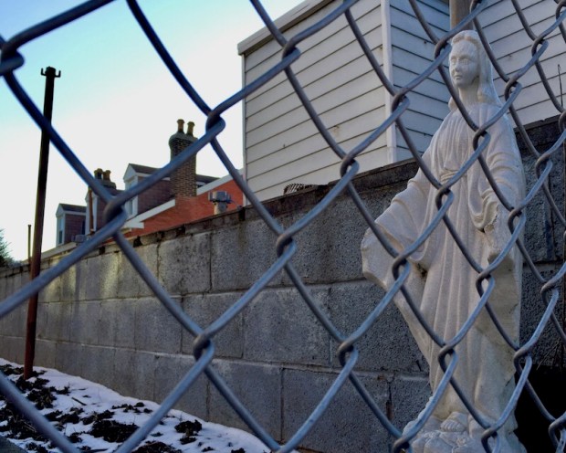 Will points out that in the Pittsburgh area, Marys are everywhere. There are Every Neighborhood Marys, Porch Marys, Built Into Brickwork/Grotto Marys, Garden Marys, Up On Cement Blocks Marys and Embedded In Concrete Flower Pot Marys—all variations on this theme that Will has photographed and blogged about for years.