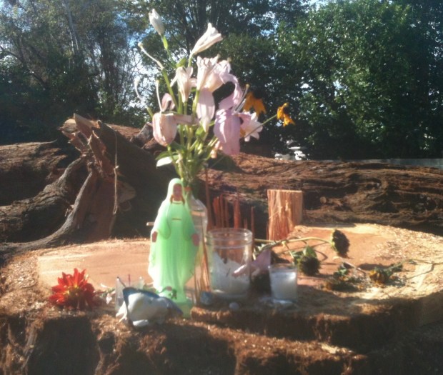 Going through my photo archive, I discovered a Mary doing actual duty as part of an altar set up on a stump left from a house demolition and tree clear cut that transpired in the Woodlawn neighborhood a few years ago. The situation created ill will with the area residents and it seemed like someone thought Mary might be able offer some solace.