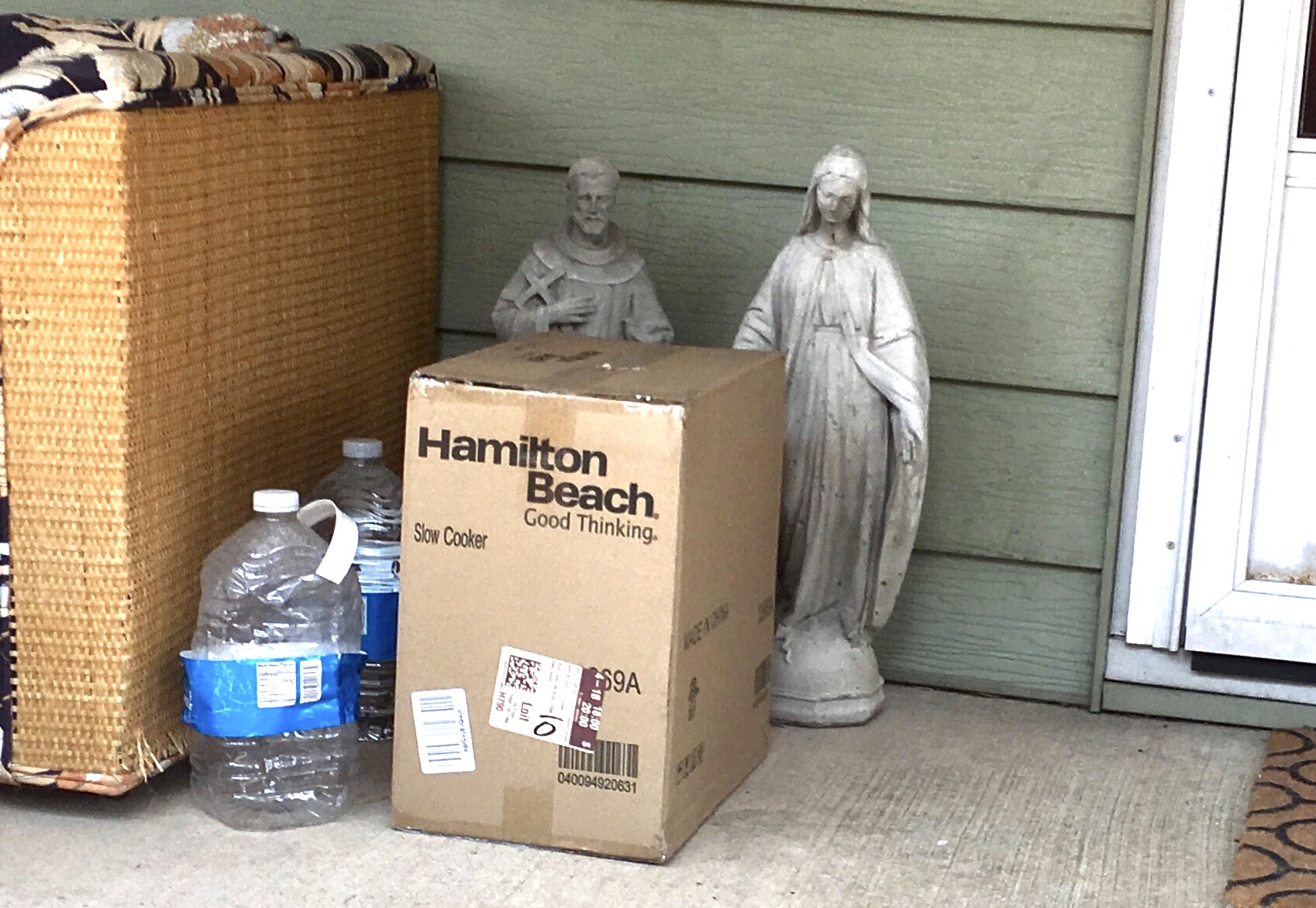 Mary has earned the right to be respected. While she winds up being yard decoration, there’s a need for her to be honored as a focal point to a design scheme. What I came across was disheartening. This Mary display was too unceremonious. To leave her on a doorstep hanging out with a random Francis or possibly Joseph seems like sacrilege. It’s a different story if she’s meant to ward off possible porch pirates. Here’s hoping Mary has the power to make someone think twice about committing theft.