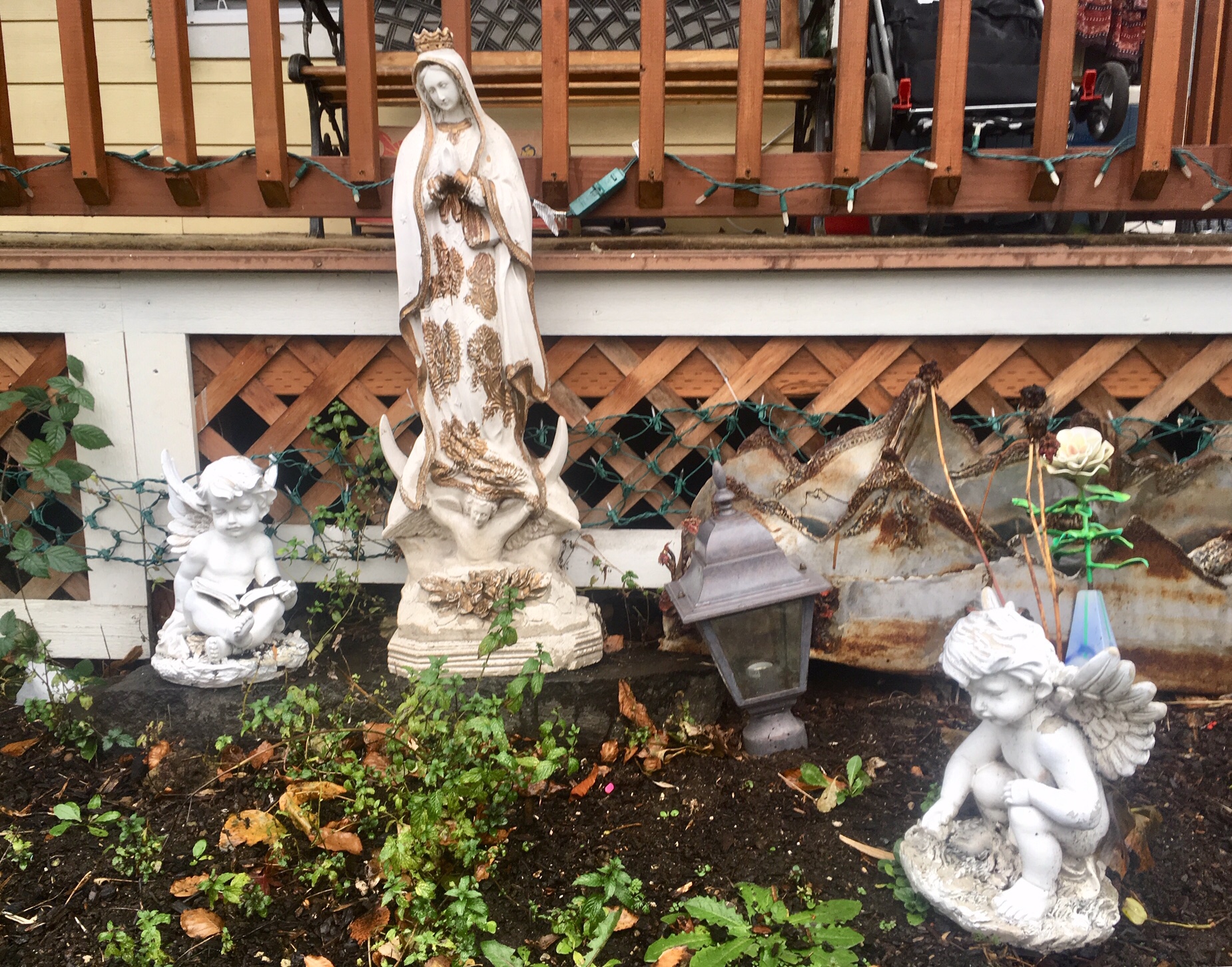 As if sculpted out of ivory or a giant bar of Ivory soap, this Mary gleams. Her namaste/prayer pose is striking. She appears to be levitating or about to launch out of the bird bath of flowers. Her serenity flows into the surrounding yard off of Interstate Avenue in the Arbor Lodge neighborhood so hard that it keeps a Fu Dog subdued and disinterested in the prey potential of the deer family reclining nearby.