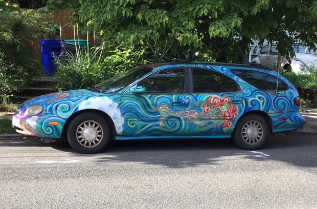 The majestic mountain subject matter always caught my attention when I saw this car in my old Kenton neighborhood. I tended to find it parked up the street in the middle of the day when the light was at its harshest. The art might not be great but I would still live in the mountainous landscape it depicts.