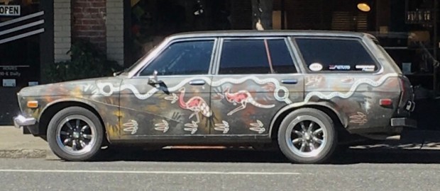 These cars seem more at home in the Outback and I’m not talking Subaru models. I’ve spotted and admired Aboriginal Art on a couple of different vehicles. While reminiscent of all things down under, it takes me back in time before there were cars. These side panels are a modern twist on a rock art tradition.