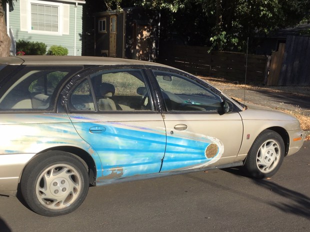 Until I saw this car I never thought about Yoga Dreams or even considered what it would be like to have one but those who have them or live them inspire me by choosing their car as a means to broadcast their lifestyle choice. The hood illustration is a mobile billboard when the car’s parked. The sunny design is an added bonus. I spotted this car in the Humboldt neighborhood and I can appreciate how the blue on the side panel creates a dream effect, floating yoga within watery confines of primordial art disguised as advertising.