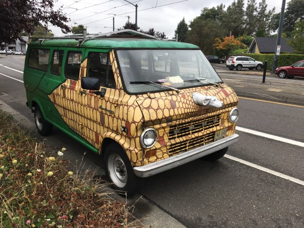 I recall the owner of this van was in the popcorn business, not that this would be the only reason to be inspired to have a corn motif painted on ones vehicle. This creation, with its mismatched kernels, is authentic enough to make anyone who noticed think they’re being chased by a giant ear of corn.